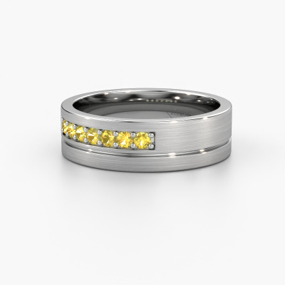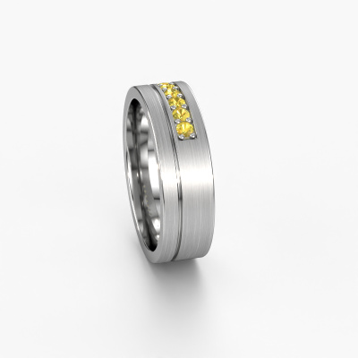 Une alliance mémoire et traditionnelles de ! Cette belle alliance pour dames est sertie d’un saphir jaune ronds. Grâce au fait que nos orfèvres fabriqueront les alliances forgée en platine à la main dans notre propre atelier, les saphirs jaunes sont placés avec la plus grande précision, de telle sorte que la lumière sur le saphir jaune rende un effet optimal. La largeur de cette alliance WH0312L16AM traditionnelles est de ±6 mm et sa finition est mate. Une fois que vous aurez composé votre bague, notre créateur de bijoux se mettra au travail. Il fera un dessin en 3D de votre alliance. Nous pouvons également utiliser ce dessin pour créer une bague factice. Vous aurez la possibilité de commander cette bague factice pour que vous puissiez voir à l'avance comment votre bague sera. Par la suite, notre orfèvre qualifié fabriquera votre bague dans notre atelier. Nous utilisons de l'or issue du commerce équitable, de telle sorte que vous puissiez obtenir une bague dont nous sommes fiers de sa composition et de son apparence. Vous pouvez également nous remettre votre propre or. Parce que nous fabriquons votre bague à la main, nous pouvons en effet utiliser votre propre or. Notre objectif est de créer une belle alliance brillante comme vous le souhaitiez !Au fait, vous pouvez être inspiré par cette bague et l'ajuster ultérieurement à votre goût. Préférez-vous un anneau plus mince ou plus large ? Préférez-vous une bague plus brillante ou mate ? Tout est possible. Aussi, si vous avez une idée de vos propres alliances extraordinaires, ou si vous avez vu un bel ensemble ailleurs qui vous plait beaucoup et que vous souhaitez personnaliser à votre goût : pas de problème ! N'hésitez pas à nous contacter. Nos designers se feront un plaisir de discuter de vos possibilités avec vous !Parce que nous ne fabriquons toutes les alliances qu'une fois les commandes passées, nous n’avons pas de frais de stocks coûteux. Tous nos bijoux sont également fabriqués selon l'artisanat traditionnel dans notre propre atelier. Cela nous permet de vous la une garantie du meilleur prix, notre prix étant 30% inférieur à celui d'autres bijoutiers. Et que vos alliances soient livrées dans la qualité des bijoutiers de confiance !Pour vous faciliter la tâche, vous pouvez facilement nous retourner tout bijou commandé dans les 30 jours suivant la livraison.