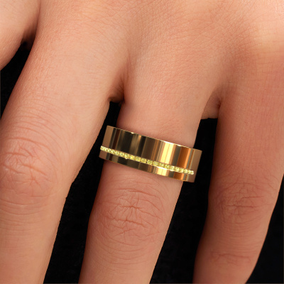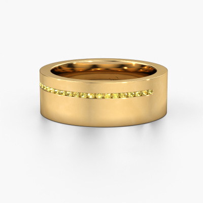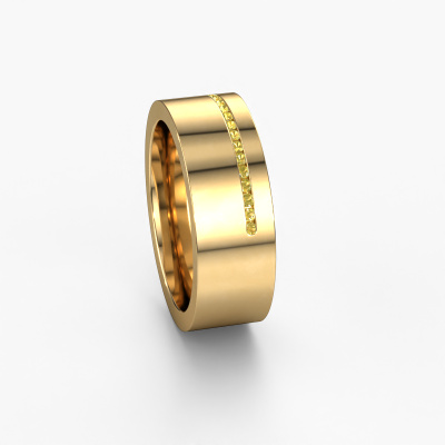 Une alliance aigus et modernes de 14 Carat ! Cette belle alliance pour dames est sertie d’un saphir jaune ronds. Grâce au fait que nos orfèvres fabriqueront les alliances forgée en or jaune à la main dans notre propre atelier, les saphirs jaunes sont placés avec la plus grande précision, de telle sorte que la lumière sur le saphir jaune rende un effet optimal. La largeur de cette alliance WH0143L17BP modernes est de ±7 mm et sa finition est brillante. Dans notre équipe spécialisée, le créateur de bijoux crée votre alliance dans un dessin 3D. Si vous le souhaitez, vous pouvez également commander une alliance factice pour pouvoir la voir et l'ajuster à l’avance. Notre orfèvre travaillera ensuite à la main dans notre atelier pour fabriquer avec précision votre bague unique. Il effectuera un travail très soigné, car la fabrication et la finition nécessitent un oeil vif. Et voici la beauté de notre métier, car à la fin de notre travail votre alliance sera le fruit d’un véritable chef d'oeuvre accompli avec passion !Laissez-vous faire inspirer par nos designs et personnalisez-les selon vos goûts : plus large ou plus petit, brillant ou mat ? Pas de problème ! Même si vous avez des idées pour vos propres alliances spéciales, nos designers de bijoux sont prêts à vous aider à concevoir la bague de vos rêves. N'hésitez pas à nous contacter !Tous les alliances sont fabriquées dans notre propre atelier dès qu’une commande est reçue. Pour cette raison, nous n'avons pas besoin de stocks coûteux et nous pouvons livrer vos alliances à un prix que vous ne trouverez chez aucun autre bijoutier.Pour vous faciliter la tâche, vous pouvez facilement nous retourner tout bijou commandé dans les 30 jours suivant la livraison.