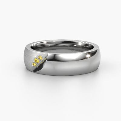 Une alliance élégants et modernes de ! Cette belle alliance pour dames est sertie d’un saphir jaune ronds. Grâce au fait que nos orfèvres fabriqueront les alliances forgée en platine à la main dans notre propre atelier, les saphirs jaunes sont placés avec la plus grande précision, de telle sorte que la lumière sur le saphir jaune rende un effet optimal. La largeur de cette alliance WH2007L modernes est de ±6 mm et sa finition est mate/poli. Dans notre équipe spécialisée, le créateur de bijoux crée votre alliance dans un dessin 3D. Si vous le souhaitez, vous pouvez également commander une alliance factice pour pouvoir la voir et l'ajuster à l’avance. Notre orfèvre travaillera ensuite à la main dans notre atelier pour fabriquer avec précision votre bague unique. Il effectuera un travail très soigné, car la fabrication et la finition nécessitent un oeil vif. Et voici la beauté de notre métier, car à la fin de notre travail votre alliance sera le fruit d’un véritable chef d'oeuvre accompli avec passion !Ce alliance peut également servir de source d’inspiration. Souhaitez-vous une bague mate ou brillante (sans frais supplémentaires), ou préférez-vous qu’elle soit plus large ou plus étroite ? Tout est possible. Comme il existe d’innombrables variations, nous ne pouvons pas tout afficher sur notre site web. Avez-vous une idée pour de magnifiques alliances ou avez-vous vu ailleurs un superbe ensemble de bagues de mariage ? Contactez-nous, nos designers sont prêts à vous aider.Les alliances ne sont fabriquées que sur commande. L'avantage principal est que nous ne faisons pas de stocks coûteux, ce qui se reflète donc dans le prix de nos bijoux. Toutes les alliances sont fabriquées dans notre propre atelier par nos propres orfèvres. Nous pouvons donc vous donner la garantie du meilleur prix, pour une bague d'une qualité des bijoutiers de confiance.Pour vous faciliter la tâche, vous pouvez facilement nous retourner tout bijou commandé dans les 30 jours suivant la livraison.