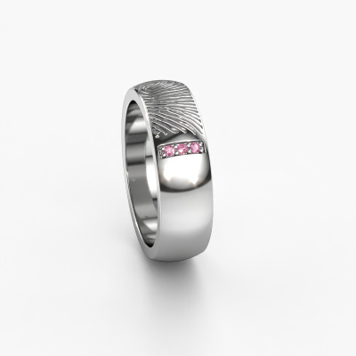 Qu'y a-t-il de plus unique qu'une empreinte digitale ? C'est la raison pour laquelle cette alliance pour dames en or blanc avec saphir rose est si spéciale. La propre empreinte de votre amoureux, gravée dans le symbole de votre amour éternel l'un pour l'autre. Que pensez-vous de la beauté de pouvoir mettre cette alliance fantaisie au doigt de votre partenaire le jour de votre mariage ? Comment ça marche ? Vous commandez d’abord l'alliance que vous souhaitez et comme vous la souhaitez. Après l'avoir commandée, envoyez-nous un email avec l'empreinte digitale. Comment vous pouvez le faire : vous pouvez le lire au bas de cette page de notre base de connaissances. La largeur de cette alliance est de ±6 mm. L'or est le symbole de l'amour, et c'est la raison pour laquelle notre orfèvre aime le transformer en une alliance fantaisie. Nous faisons partie du Responsible Jewellery Council (Conseil de Joaillerie Responsable). Cela signifie que nous travaillons avec de l'or responsable, un procédé dont nous sommes naturellement fiers. Il est également possible que votre propre or soit utilisé pour forger votre alliance. Grâce au fait que tous nos bijoux sont fabriqués à la main par notre orfèvre dans notre atelier, nous pouvons vous proposer cette option. Cela vous donne la possibilité de personnaliser encore davantage votre bague, en faire une bague avec une histoire !Au fait, vous pouvez être inspiré par cette bague et l'ajuster ultérieurement à votre goût. Préférez-vous un anneau plus mince ou plus large ? Préférez-vous une bague plus brillante ou mate ? Tout est possible. Aussi, si vous avez une idée de vos propres alliances extraordinaires, ou si vous avez vu un bel ensemble ailleurs qui vous plait beaucoup et que vous souhaitez personnaliser à votre goût : pas de problème ! N'hésitez pas à nous contacter. Nos designers se feront un plaisir de discuter de vos possibilités avec vous !Puisque nous concevons et livrons nos propres alliances, nous sommes en mesure de vous proposer une alliance à un prix que vous ne pourrez pas trouver ailleurs. Une alliance est fabriquée sur commande, ce qui permet d'éviter les excédents de matériel et nous permet de vous proposer une superbe offre de prix. Nous comprenons qu'acheter votre alliance en ligne soit un risque, mais nous vous assistons volontiers dans le processus de conception, en tenant compte de votre budget.Pour vous faciliter la tâche, vous pouvez facilement nous retourner tout bijou commandé dans les 30 jours suivant la livraison.