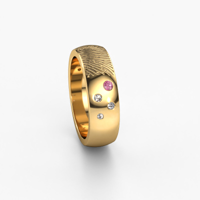 Qu'y a-t-il de plus unique qu'une empreinte digitale ? C'est la raison pour laquelle cette alliance pour unisexe en or jaune avec saphir rose est si spéciale. La propre empreinte de votre amoureux, gravée dans le symbole de votre amour éternel l'un pour l'autre. Que pensez-vous de la beauté de pouvoir mettre cette alliance modernes au doigt de votre partenaire le jour de votre mariage ? Comment ça marche ? Vous commandez d’abord l'alliance que vous souhaitez et comme vous la souhaitez. Après l'avoir commandée, envoyez-nous un email avec l'empreinte digitale. Comment vous pouvez le faire : vous pouvez le lire au bas de cette page de notre base de connaissances. La largeur de cette alliance est de ±6 mm. Une fois que vous aurez composé votre bague, notre créateur de bijoux se mettra au travail. Il fera un dessin en 3D de votre alliance. Nous pouvons également utiliser ce dessin pour créer une bague factice. Vous aurez la possibilité de commander cette bague factice pour que vous puissiez voir à l'avance comment votre bague sera. Par la suite, notre orfèvre qualifié fabriquera votre bague dans notre atelier. Nous utilisons de l'or issue du commerce équitable, de telle sorte que vous puissiez obtenir une bague dont nous sommes fiers de sa composition et de son apparence. Vous pouvez également nous remettre votre propre or. Parce que nous fabriquons votre bague à la main, nous pouvons en effet utiliser votre propre or. Notre objectif est de créer une belle alliance brillante comme vous le souhaitiez !Au fait, vous pouvez être inspiré par cette bague et l'ajuster ultérieurement à votre goût. Préférez-vous un anneau plus mince ou plus large ? Préférez-vous une bague plus brillante ou mate ? Tout est possible. Aussi, si vous avez une idée de vos propres alliances extraordinaires, ou si vous avez vu un bel ensemble ailleurs qui vous plait beaucoup et que vous souhaitez personnaliser à votre goût : pas de problème ! N'hésitez pas à nous contacter. Nos designers se feront un plaisir de discuter de vos possibilités avec vous !Puisque nous concevons et livrons nos propres alliances, nous sommes en mesure de vous proposer une alliance à un prix que vous ne pourrez pas trouver ailleurs. Une alliance est fabriquée sur commande, ce qui permet d'éviter les excédents de matériel et nous permet de vous proposer une superbe offre de prix. Nous comprenons qu'acheter votre alliance en ligne soit un risque, mais nous vous assistons volontiers dans le processus de conception, en tenant compte de votre budget.Pour vous faciliter la tâche, vous pouvez facilement nous retourner tout bijou commandé dans les 30 jours suivant la livraison.