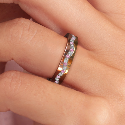 Saviez-vous que la bague éternité Ladies n'a pas que du charisme, mais est aussi symboliquement une magnifique alliance ? L’alliance éternité, avec les saphirs roses sertis les uns à côté des autres, représente votre amour éternel. Puisque les pierres sont serties tout autour de l’anneau, il n'y a pas de début ni de fin. Un symbole merveilleux, non ? La largeur de cette alliance détail ondulé WH0803L14AP en or jaune est de ±4 mm et elle est sertie d’un saphir rose de 1.3 mm. Dans notre équipe spécialisée, le créateur de bijoux crée votre alliance dans un dessin 3D. Si vous le souhaitez, vous pouvez également commander une alliance factice pour pouvoir la voir et l'ajuster à l’avance. Notre orfèvre travaillera ensuite à la main dans notre atelier pour fabriquer avec précision votre bague unique. Il effectuera un travail très soigné, car la fabrication et la finition nécessitent un oeil vif. Et voici la beauté de notre métier, car à la fin de notre travail votre alliance sera le fruit d’un véritable chef d'oeuvre accompli avec passion !Ce alliance peut également servir de source d’inspiration. Souhaitez-vous une bague mate ou brillante (sans frais supplémentaires), ou préférez-vous qu’elle soit plus large ou plus étroite ? Tout est possible. Comme il existe d’innombrables variations, nous ne pouvons pas tout afficher sur notre site web. Avez-vous une idée pour de magnifiques alliances ou avez-vous vu ailleurs un superbe ensemble de bagues de mariage ? Contactez-nous, nos designers sont prêts à vous aider.Puisque nous concevons et livrons nos propres alliances, nous sommes en mesure de vous proposer une alliance à un prix que vous ne pourrez pas trouver ailleurs. Une alliance est fabriquée sur commande, ce qui permet d'éviter les excédents de matériel et nous permet de vous proposer une superbe offre de prix. Nous comprenons qu'acheter votre alliance en ligne soit un risque, mais nous vous assistons volontiers dans le processus de conception, en tenant compte de votre budget.Pour vous faciliter la tâche, vous pouvez facilement nous retourner tout bijou commandé dans les 30 jours suivant la livraison.