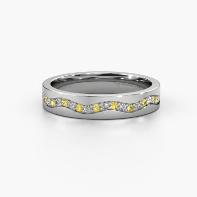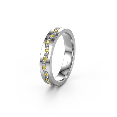 Saviez-vous que la bague éternité Ladies n'a pas que du charisme, mais est aussi symboliquement une magnifique alliance ? L’alliance éternité, avec les saphirs jaunes sertis les uns à côté des autres, représente votre amour éternel. Puisque les pierres sont serties tout autour de l’anneau, il n'y a pas de début ni de fin. Un symbole merveilleux, non ? La largeur de cette alliance détail ondulé WH0803L14AP en platine est de ±4 mm et elle est sertie d’un saphir jaune de 1.3 mm. Dans notre équipe spécialisée, le créateur de bijoux crée votre alliance dans un dessin 3D. Si vous le souhaitez, vous pouvez également commander une alliance factice pour pouvoir la voir et l'ajuster à l’avance. Notre orfèvre travaillera ensuite à la main dans notre atelier pour fabriquer avec précision votre bague unique. Il effectuera un travail très soigné, car la fabrication et la finition nécessitent un oeil vif. Et voici la beauté de notre métier, car à la fin de notre travail votre alliance sera le fruit d’un véritable chef d'oeuvre accompli avec passion !Ce alliance peut également servir de source d’inspiration. Souhaitez-vous une bague mate ou brillante (sans frais supplémentaires), ou préférez-vous qu’elle soit plus large ou plus étroite ? Tout est possible. Comme il existe d’innombrables variations, nous ne pouvons pas tout afficher sur notre site web. Avez-vous une idée pour de magnifiques alliances ou avez-vous vu ailleurs un superbe ensemble de bagues de mariage ? Contactez-nous, nos designers sont prêts à vous aider.Puisque nous concevons et livrons nos propres alliances, nous sommes en mesure de vous proposer une alliance à un prix que vous ne pourrez pas trouver ailleurs. Une alliance est fabriquée sur commande, ce qui permet d'éviter les excédents de matériel et nous permet de vous proposer une superbe offre de prix. Nous comprenons qu'acheter votre alliance en ligne soit un risque, mais nous vous assistons volontiers dans le processus de conception, en tenant compte de votre budget.Pour vous faciliter la tâche, vous pouvez facilement nous retourner tout bijou commandé dans les 30 jours suivant la livraison.