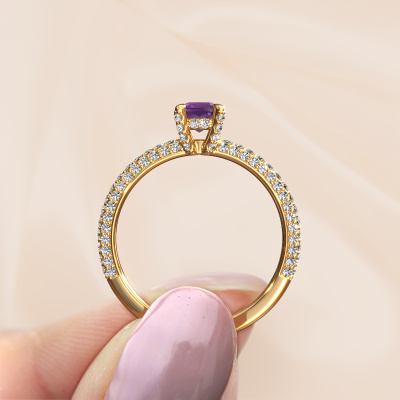 La bague de fiançailles mentionnée ci-dessus a été nommée Saskia 2 cus. Ce type de bague de fiançailles est appelé une bague de fiançailles solitaire pavé car elle ne comporte qu’une seule pierre centrale et les tiges de la bague de fiançailles sont également pleins. La bague de fiançailles est faite dans une combinaison d'or 14 Carat et d’or jaune et a un améthyste coussin d’une de 4.5 mm, et des diamants synthétiques sont sertis sur les épaules de l’anneau. Chaque bijou est faite spécialement pour vous, avec une attention particulière portée aux détails et au design. Cette bague de fiançailles solitaire pavé forgée en or jaune contemporains a un beau améthystes coussin comme pierre centrale, avec plus de améthystes sertis dans la bague pour accentuer encore plus la présence de la pierre centrale. Le sertissage à griffes autour du améthyste étant ouvert, le améthyste capte la lumière de tous les côtés et brille de manière optimale. Ci-dessus, vous pouvez voir comment notre orfèvre travaille la bague de fiançailles avec une extrême précision dans les moindres détails, de telle sorte que le améthyste élevé puisse attirer tous les regards. Quelle belle bague de fiançailles à offrir lors de votre demande en mariage à l'amour de votre vie, à votre centre rayonnant ! Vous avez peut-être remarqué que nos prix sont en moyenne inférieurs de 30% à ceux d'un autre bijoutier. Et ce alors que la qualité de nos bijoux est même plus élevée dans la plupart des cas ! En effet, nos orfèvres fabriquent votre bague de fiançailles directement dans notre propre atelier. Cela signifie que nous n'avons pas à inclure des frais de stocks coûteux et que nous pouvons travailler n'importe quel détail directement sur votre bague de fiançailles.Notre équipe de designers talentueux et passionnés ajoute chaque jour de nouveaux modèles bague de fiançailles à notre collection en ligne. Notre objectif est de pouvoir vous offrir une grande variété de bijoux. N'hésitez pas à demander un devis si vous avez des souhaits spécifiques pour votre bague de fiançailles. Nous garantissons de vous faire une offre que vous ne pourrez pas refuser.Pour vous faciliter la tâche, vous pouvez facilement nous retourner tout bijou commandé dans les 30 jours suivant la livraison.