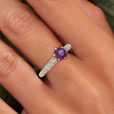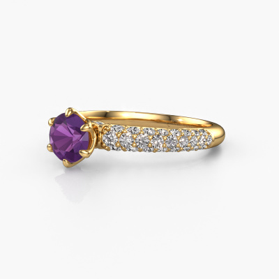 Nous avons donné le nom Meryl à la bague de fiançailles mentionnée ci-dessous. Ce type de bague de fiançailles est appelé une bague de fiançailles solitaire pavé car elle ne comporte qu’une seule pierre centrale et les tiges de la bague de fiançailles ont également une finition pleine. Cette bague de fiançailles est forgée en or 14 Carat et comporte un améthyste ronds de 5.7 mm. Des diamants sont sertis dans les épaules latérales de l’anneau. Chaque bijou est faite spécialement pour vous, avec une attention particulière portée aux détails et au design.. Cette bague de fiançailles solitaire pavé forgée en or jaune exclusives a un beau améthyste ronds en guise de pierre centrale, avec plus de diamants dans l’anneau pour accentuer encore plus l’effet de la pierre centrale. Le sertissage à griffes autour du améthyste étant ouvert, le améthyste capte la lumière de tous les côtés et brille de manière optimale. Ci-dessus, vous pouvez voir comment notre orfèvre a travaillé la bague de fiançailles dans les moindres détails. de telle sorte que le améthyste élevé puisse véritablement attirer tous les regards. Quelle belle bague de fiançailles à offre lors de votre demande en mariage à l'amour de votre vie, à votre centre rayonnant ! Saviez-vous que nous offrons la garantie du meilleur prix pour votre bague de fiançailles? Cela est possible car tous nos bijoux sont fabriqués à la main dans notre propre atelier. Nous n'avons pas de frais de stocks qui sont coûteux, et nous fabriquons votre bague uniquement une fois que vous l'avez commandée. Grâce au fait que nous ayons toute la production du bijou en main, nous pouvons vous informer sur toutes les caractéristiques de cette bague de fiançailles. C’est précisément parce que l’achat d’une bague en ligne est une expérience excitante que nous comprenons qu’il est plus confortable pour vous de connaître toutes les caractéristiques de votre bague.Avez-vous déjà des bague de fiançailles spécifiques en tête ? Une bague de fiançailles que vous avez vu quelque part. N'hésitez pas à nous faire part de vos souhaits et nous transformerons votre design en des bague de fiançailles uniques. Vous êtes en mesure de suivre l'évolution de la conception de vos bague de fiançailles car nous utilisons des dessins en 3D. Cela vous donnera un aperçu réaliste de votre design. Nous vous enverrons volontiers une offre sans engagement basée sur un rapport qualité / prix juste. Elle va vous étonner.Pour vous faciliter la tâche, vous pouvez facilement nous retourner tout bijou commandé dans les 30 jours suivant la livraison.