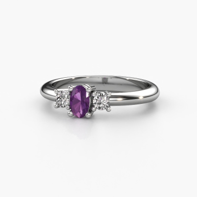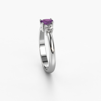 Le nom de cette bague de fiançailles est Karie. Elle est forgée en or 14 Carat et est sertie d'un améthyste de 5x3 mm. Comment décririez-vous le style de l'amour de votre vie ? Est-ce qu'elle aime quelque chose qui est juste un peu plus différent que d'habitude ? Cette bague de fiançailles forgée en or blanc avec ajour est une superbe bague que vous pouvez personnaliser à votre guise. Un améthyste est utilisé dans cette bague de fiançailles traditionnelles. Ces améthystes ont été sélectionnés avec soin, car nous pensons que sur votre bague de fiançailles, seule les plus belle pierre précieuses peuvent y briller, n'est-ce pas ? Ce bijou est fabriquée spécialement pour vous par nos maîtres orfèvres dans notre propre atelier.Saviez-vous que nous offrons la garantie du meilleur prix pour votre bague de fiançailles? Cela est possible car tous nos bijoux sont fabriqués à la main dans notre propre atelier. Nous n'avons pas de frais de stocks qui sont coûteux, et nous fabriquons votre bague uniquement une fois que vous l'avez commandée. Grâce au fait que nous ayons toute la production du bijou en main, nous pouvons vous informer sur toutes les caractéristiques de cette bague de fiançailles. C’est précisément parce que l’achat d’une bague en ligne est une expérience excitante que nous comprenons qu’il est plus confortable pour vous de connaître toutes les caractéristiques de votre bague. Avez-vous déjà des bague de fiançailles spécifiques en tête ? Une bague de fiançailles que vous avez vu quelque part. N'hésitez pas à nous faire part de vos souhaits et nous transformerons votre design en des bague de fiançailles uniques. Vous êtes en mesure de suivre l'évolution de la conception de vos bague de fiançailles car nous utilisons des dessins en 3D. Cela vous donnera un aperçu réaliste de votre design. Nous vous enverrons volontiers une offre sans engagement basée sur un rapport qualité / prix juste. Elle va vous étonner.Pour vous faciliter la tâche, vous pouvez facilement nous retourner tout bijou commandé dans les 30 jours suivant la livraison.
