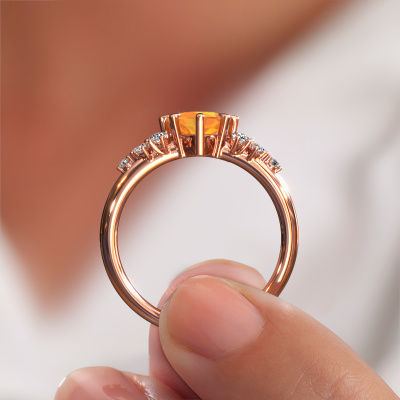 Le nom de cette bague de fiançailles est Royce TRI. Elle est forgée en or 14 Carat et est sertie d'un citrine de 7 mm. Comment décririez-vous le style de l'amour de votre vie ? Est-ce qu'elle aime quelque chose qui est juste un peu plus