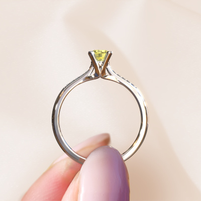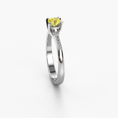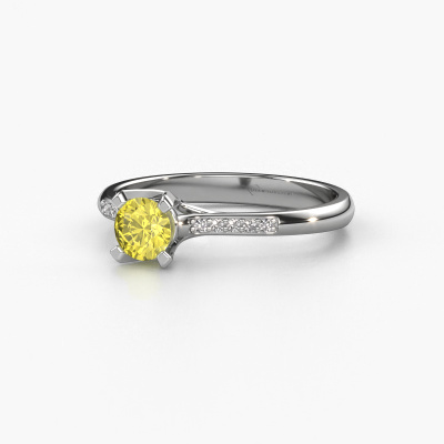 Nous avons donné le nom Isa 2 à la bague de fiançailles mentionnée ci-dessous. Ce type de bague de fiançailles est appelé une bague de fiançailles solitaire pavé car elle ne comporte qu’une seule pierre centrale et les tiges de la bague de fiançailles ont également une finition pleine. Cette bague de fiançailles est forgée en or 14 Carat et comporte un diamants synthétiques jaune ronds de 4.2 mm. Des diamants sont sertis dans les épaules latérales de l’anneau. Chaque bijou est faite pour briller sur votre doigt, chaque bijou est fabriqué à la main par nos orfèvres.. Cette bague de fiançailles solitaire pavé forgée en or blanc classiques a un beau diamants synthétiques jaune ronds en guise de pierre centrale, avec plus de diamants dans l’anneau pour accentuer encore plus l’effet de la pierre centrale. Le sertissage à griffes autour du diamants synthétiques jaune étant ouvert, le diamants synthétiques jaune capte la lumière de tous les côtés et brille de manière optimale. Ci-dessus, vous pouvez voir comment notre orfèvre a travaillé la bague de fiançailles dans les moindres détails. de telle sorte que le diamants synthétiques jaune élevé puisse véritablement attirer tous les regards. Quelle belle bague de fiançailles à offre lors de votre demande en mariage à l'amour de votre vie, à votre centre rayonnant !