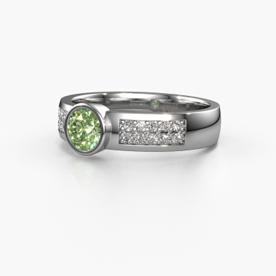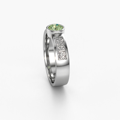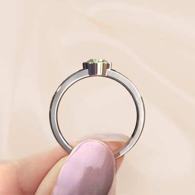 La bague de fiançailles mentionnée ci-dessus a été nommée Ise 3. Ce type de bague de fiançailles est appelé une bague de fiançailles solitaire pavé car elle ne comporte qu’une seule pierre centrale et les tiges de la bague de fiançailles sont également pleins. La bague de fiançailles est faite dans une combinaison d'or et d’platine et a un diamants synthétiques vert ronds d’une de 4.7 mm, et des diamants sont sertis sur les épaules de l’anneau. Chaque bijou est fabriquée spécialement pour vous par nos maîtres orfèvres dans notre propre atelier. Cette bague de fiançailles solitaire pavé forgée en platine modernes a un beau diamants synthétiques vert ronds comme pierre centrale, avec plus de diamants synthétiques vert sertis dans la bague pour accentuer encore plus la présence de la pierre centrale. Le sertissage à griffes autour du diamants synthétiques vert étant ouvert, le diamants synthétiques vert capte la lumière de tous les côtés et brille de manière optimale. Ci-dessus, vous pouvez voir comment notre orfèvre travaille la bague de fiançailles avec une extrême précision dans les moindres détails, de telle sorte que le diamants synthétiques vert élevé puisse attirer tous les regards. Quelle belle bague de fiançailles à offrir lors de votre demande en mariage à l'amour de votre vie, à votre centre rayonnant !