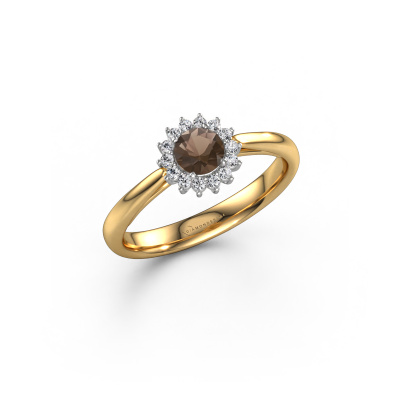 La bague de fiançailles présentée ci-dessus a été nommée Tilly RND 1. Nous appelons ce type de bague de fiançailles une bague entourage. Ici, de petites pierres précieuses sont serties autour de la pierre centrale dans un sertissage ouvert. Cette bague de fiançailles forgée en or 14 Carat a un quartz fumé ronds de 4.2 mm en guise de pierre centrale qui est aussi entourée de petits diamants. Les petites pierres précieuses qui sont serties autour du large quartz fumé sous la forme d’une belle fleur rendent cette bague de fiançailles entourage forgée en or jaune classiques si spéciale. Ils donnent l'effet de former une grosse pierre précieuse étincelante. Cette bague de fiançailles peut aussi avoir un autre nom tel que bague fleur ou la bague rosette. Cependant, ces petits quartz fumé doivent tous être sertis de la même manière, afin que la lumière pénétrant dans le quartz fumé ne soit pas interrompue et qu'une belle unité soit effectivement créée. Voici donc le travail de nos maîtres orfèvres. Avec la plus grande précision, chaque quartz fumé soigneusement sélectionné est serti à la main dans la bague de fiançailles. Toujours et encore, la bague de fiançailles est examinée sous la lumière pour voir si l'effet spécial désiré est encore visible. Le résultat est donc une bague de fiançailles unique, où le quartz fumé choisi devient littéralement le centre brillants. Vous pouvez imaginer que cette bague de fiançailles est vraiment une bague de fiançailles significative à offrir à votre amour de votre vie ! Le jour où vous lui montrerez qu'elle est le centre brillants de votre vie ! Ce bijou est fabriquées avec passion et amour par l'un de nos maîtres orfèvres.En combinant les dernières techniques modernes, associées à une fabrication ancienne, nous sommes en mesure de fabriquer nos bagues de fiançailles dans notre propre studio. Chaque bijou est fabriqué sur commande. Ceci est avantageux car nous sommes en mesure de vous proposer un prix que vous ne trouverez nulle part ailleurs.Notre équipe ajoute quotidiennement de nouveaux modèles à notre collection en ligne. Nos designers et orfèvres travaillent ensemble pour créer le meilleur design. Nous nous efforçons d'offrir une collection diversifiée de bijoux. Peut-être avez-vous déjà en tête un bijou en particulier ? Un bijou que vous avez trouvé quelque part. Veuillez nous contacter pour une consultation gratuite. Nous vous ferons une offre, basée sur un rapport qualité / prix juste, qui vous déconcertera.Pour vous faciliter la tâche, vous pouvez facilement nous retourner tout bijou commandé dans les 30 jours suivant la livraison.