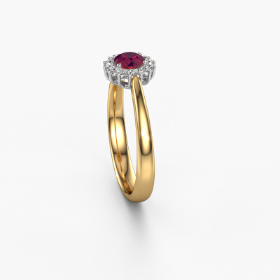 La bague de fiançailles présentée ci-dessus a été nommée Tilly RND 1. Nous appelons ce type de bague de fiançailles une bague entourage. Ici, de petites pierres précieuses sont serties autour de la pierre centrale dans un sertissage ouvert. Cette bague de fiançailles forgée en or 14 Carat a un rhodolite ronds de 4.2 mm en guise de pierre centrale qui est aussi entourée de petits diamants. Les petites pierres précieuses qui sont serties autour du large rhodolite sous la forme d’une belle fleur rendent cette bague de fiançailles entourage forgée en or jaune classiques si spéciale. Ils donnent l'effet de former une grosse pierre précieuse étincelante. Cette bague de fiançailles peut aussi avoir un autre nom tel que bague fleur ou la bague rosette. Cependant, ces petits rhodolites doivent tous être sertis de la même manière, afin que la lumière pénétrant dans le rhodolite ne soit pas interrompue et qu'une belle unité soit effectivement créée. Voici donc le travail de nos maîtres orfèvres. Avec la plus grande précision, chaque rhodolite soigneusement sélectionné est serti à la main dans la bague de fiançailles. Toujours et encore, la bague de fiançailles est examinée sous la lumière pour voir si l'effet spécial désiré est encore visible. Le résultat est donc une bague de fiançailles unique, où le rhodolite choisi devient littéralement le centre brillants. Vous pouvez imaginer que cette bague de fiançailles est vraiment une bague de fiançailles significative à offrir à votre amour de votre vie ! Le jour où vous lui montrerez qu'elle est le centre brillants de votre vie ! Ce bijou est fabriquées avec passion et amour par l'un de nos maîtres orfèvres.En combinant les dernières techniques modernes, associées à une fabrication ancienne, nous sommes en mesure de fabriquer nos bagues de fiançailles dans notre propre studio. Chaque bijou est fabriqué sur commande. Ceci est avantageux car nous sommes en mesure de vous proposer un prix que vous ne trouverez nulle part ailleurs.Notre équipe ajoute quotidiennement de nouveaux modèles à notre collection en ligne. Nos designers et orfèvres travaillent ensemble pour créer le meilleur design. Nous nous efforçons d'offrir une collection diversifiée de bijoux. Peut-être avez-vous déjà en tête un bijou en particulier ? Un bijou que vous avez trouvé quelque part. Veuillez nous contacter pour une consultation gratuite. Nous vous ferons une offre, basée sur un rapport qualité / prix juste, qui vous déconcertera.Pour vous faciliter la tâche, vous pouvez facilement nous retourner tout bijou commandé dans les 30 jours suivant la livraison.