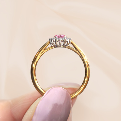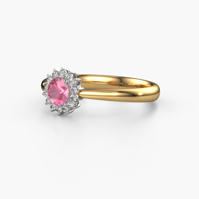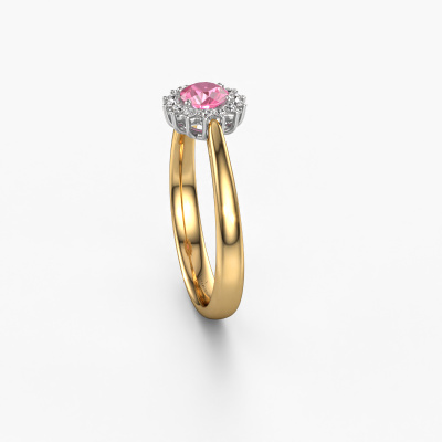 La bague de fiançailles présentée ci-dessus a été nommée Tilly RND 1. Nous appelons ce type de bague de fiançailles une bague entourage. Ici, de petites pierres précieuses sont serties autour de la pierre centrale dans un sertissage ouvert. Cette bague de fiançailles forgée en or 14 Carat a un saphir rose ronds de 4.2 mm en guise de pierre centrale qui est aussi entourée de petits diamants. Les petites pierres précieuses qui sont serties autour du large saphir rose sous la forme d’une belle fleur rendent cette bague de fiançailles entourage forgée en or jaune classiques si spéciale. Ils donnent l'effet de former une grosse pierre précieuse étincelante. Cette bague de fiançailles peut aussi avoir un autre nom tel que bague fleur ou la bague rosette. Cependant, ces petits saphirs roses doivent tous être sertis de la même manière, afin que la lumière pénétrant dans le saphir rose ne soit pas interrompue et qu'une belle unité soit effectivement créée. Voici donc le travail de nos maîtres orfèvres. Avec la plus grande précision, chaque saphir rose soigneusement sélectionné est serti à la main dans la bague de fiançailles. Toujours et encore, la bague de fiançailles est examinée sous la lumière pour voir si l'effet spécial désiré est encore visible. Le résultat est donc une bague de fiançailles unique, où le saphir rose choisi devient littéralement le centre brillants. Vous pouvez imaginer que cette bague de fiançailles est vraiment une bague de fiançailles significative à offrir à votre amour de votre vie ! Le jour où vous lui montrerez qu'elle est le centre brillants de votre vie ! Ce bijou est fabriquées avec passion et amour par l'un de nos maîtres orfèvres.En combinant les dernières techniques modernes, associées à une fabrication ancienne, nous sommes en mesure de fabriquer nos bagues de fiançailles dans notre propre studio. Chaque bijou est fabriqué sur commande. Ceci est avantageux car nous sommes en mesure de vous proposer un prix que vous ne trouverez nulle part ailleurs.Notre équipe ajoute quotidiennement de nouveaux modèles à notre collection en ligne. Nos designers et orfèvres travaillent ensemble pour créer le meilleur design. Nous nous efforçons d'offrir une collection diversifiée de bijoux. Peut-être avez-vous déjà en tête un bijou en particulier ? Un bijou que vous avez trouvé quelque part. Veuillez nous contacter pour une consultation gratuite. Nous vous ferons une offre, basée sur un rapport qualité / prix juste, qui vous déconcertera.Pour vous faciliter la tâche, vous pouvez facilement nous retourner tout bijou commandé dans les 30 jours suivant la livraison.