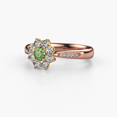 La bague de fiançailles présentée ci-dessus a été nommée Carolyn 2. Nous appelons ce type de bague de fiançailles une bague entourage. Ici, de petites pierres précieuses sont serties autour de la pierre centrale dans un sertissage ouvert. Cette bague de fiançailles forgée en or 14 Carat a un vert tourmaline ronds de 3.4 mm en guise de pierre centrale qui est aussi entourée de petits diamants. Les petites pierres précieuses qui sont serties autour du large vert tourmaline sous la forme d’une belle fleur rendent cette bague de fiançailles entourage forgée en or rose traditionnelles si spéciale. Ils donnent l'effet de former une grosse pierre précieuse étincelante. Cette bague de fiançailles peut aussi avoir un autre nom tel que bague fleur ou la bague rosette. Cependant, ces petits vert tourmaline doivent tous être sertis de la même manière, afin que la lumière pénétrant dans le vert tourmaline ne soit pas interrompue et qu'une belle unité soit effectivement créée. Voici donc le travail de nos maîtres orfèvres. Avec la plus grande précision, chaque vert tourmaline soigneusement sélectionné est serti à la main dans la bague de fiançailles. Toujours et encore, la bague de fiançailles est examinée sous la lumière pour voir si l'effet spécial désiré est encore visible. Le résultat est donc une bague de fiançailles unique, où le vert tourmaline choisi devient littéralement le centre brillants. Vous pouvez imaginer que cette bague de fiançailles est vraiment une bague de fiançailles significative à offrir à votre amour de votre vie ! Le jour où vous lui montrerez qu'elle est le centre brillants de votre vie ! Ce bijou est unique car vous pouvez entièrement l'assembler à votre guise.Vous avez peut-être remarqué que nos prix sont en moyenne inférieurs de 30% à ceux d'un autre bijoutier. Et ce alors que la qualité de nos bijoux est même plus élevée dans la plupart des cas ! En effet, nos orfèvres fabriquent votre bague de fiançailles directement dans notre propre atelier. Cela signifie que nous n'avons pas à inclure des frais de stocks coûteux et que nous pouvons travailler n'importe quel détail directement sur votre bague de fiançailles.Notre équipe ajoute quotidiennement de nouveaux modèles à notre collection en ligne. Nos designers et orfèvres travaillent ensemble pour créer le meilleur design. Nous nous efforçons d'offrir une collection diversifiée de bijoux. Peut-être avez-vous déjà en tête un bijou en particulier ? Un bijou que vous avez trouvé quelque part. Veuillez nous contacter pour une consultation gratuite. Nous vous ferons une offre, basée sur un rapport qualité / prix juste, qui vous déconcertera.Pour vous faciliter la tâche, vous pouvez facilement nous retourner tout bijou commandé dans les 30 jours suivant la livraison.
