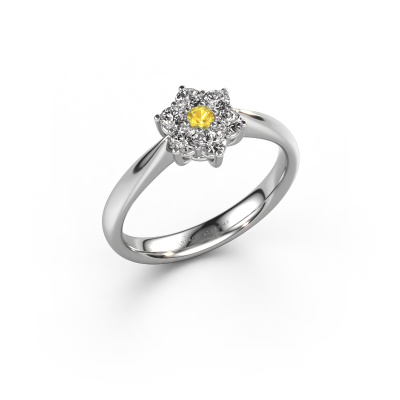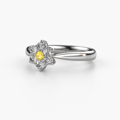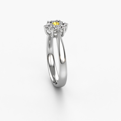 La bague de fiançailles présentée ci-dessus a été nommée Chantal 1. Nous appelons ce type de bague de fiançailles une bague flower. Ici, de petites pierres précieuses sont serties autour de la pierre centrale dans un sertissage ouvert. Cette bague de fiançailles forgée en or a un saphir jaune ronds de 2.4 mm en guise de pierre centrale qui est aussi entourée de petits diamants. Les petites pierres précieuses qui sont serties autour du large saphir jaune sous la forme d’une belle fleur rendent cette bague de fiançailles flower forgée en platine traditionnelles si spéciale. Ils donnent l'effet de former une grosse pierre précieuse étincelante. Cette bague de fiançailles peut aussi avoir un autre nom tel que bague fleur ou la bague rosette. Cependant, ces petits saphirs jaunes doivent tous être sertis de la même manière, afin que la lumière pénétrant dans le saphir jaune ne soit pas interrompue et qu'une belle unité soit effectivement créée. Voici donc le travail de nos maîtres orfèvres. Avec la plus grande précision, chaque saphir jaune soigneusement sélectionné est serti à la main dans la bague de fiançailles. Toujours et encore, la bague de fiançailles est examinée sous la lumière pour voir si l'effet spécial désiré est encore visible. Le résultat est donc une bague de fiançailles unique, où le saphir jaune choisi devient littéralement le centre brillants. Vous pouvez imaginer que cette bague de fiançailles est vraiment une bague de fiançailles significative à offrir à votre amour de votre vie ! Le jour où vous lui montrerez qu'elle est le centre brillants de votre vie ! Ce bijou est unique car vous pouvez entièrement l'assembler à votre guise.Qu'y a-t-il dorénavant de plus beau qu'une bague de fiançailles traditionnelles conçue par vous-même et fabriquée à la main par nous. Vous pouvez personnaliser chaque modèle avec les différents métaux précieux et pierres précieuses. De cette façon, vous pourrez créer une bague de fiançailles unique. Cette bague peut être mise en place de plusieurs façons. Bien sûr, vous pouvez toujours nous contacter et nous serons heureux de vous aider à composer votre bague de fiançailles traditionnelles Chantal 1. Vous aimez le design, mais vous souhaitez tout de même quelque chose qui vous convienne plus, ou bien vous souhaitez une pierre précieuse dans les bijoux que vous ne pouvez pas choisir sur notre site, contactez-nous et nous vous aiderons.Notre équipe de designers talentueux et passionnés ajoute chaque jour de nouveaux modèles bague de fiançailles à notre collection en ligne. Notre objectif est de pouvoir vous offrir une grande variété de bijoux. N'hésitez pas à demander un devis si vous avez des souhaits spécifiques pour votre bague de fiançailles. Nous garantissons de vous faire une offre que vous ne pourrez pas refuser.Pour vous faciliter la tâche, vous pouvez facilement nous retourner tout bijou commandé dans les 30 jours suivant la livraison.
