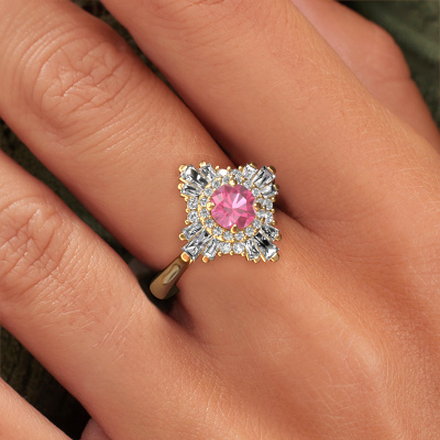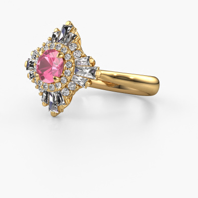 Nous avons donné le nom Thalia à cette bague de fiançailles. Cette bague forgée en or 14 Carat est sertie d’un saphir rose de 5.4 mm. Cette bague est une large bague vintage forgée en or jaune unique qui fera certainement briller l’amour de votre vie ! Et c'est exactement ce que nous avons comme objectif. Un beau saphir rose est serti dans cette bague de fiançailles vintage. Vous pouvez, bien entendu, utiliser chaque pierre précieuses que nous proposons sur notre site La pierre précieuse sera sélectionnée avec soin, car nous pensons que seule la plus belle des pierres précieuses peut briller sur votre bague de fiançailles spéciales, qu’en dites-vous ? Notre orfèvre fabrique votre bague de fiançailles dans notre propre atelier et place le saphir rose dans l'anneau de la bague avec une précision extrême. Donc, elle est travaillée et polie jusqu'à ce que le résultat désiré soit visible : la bague de fiançailles parfaite pour l'amour de votre vie ! Ce bijou est faite avec passion et amour par l'un de nos maîtres orfèvres.Saviez-vous que nous offrons la garantie du meilleur prix pour votre bague de fiançailles? Cela est possible car tous nos bijoux sont fabriqués à la main dans notre propre atelier. Nous n'avons pas de frais de stocks qui sont coûteux, et nous fabriquons votre bague uniquement une fois que vous l'avez commandée. Grâce au fait que nous ayons toute la production du bijou en main, nous pouvons vous informer sur toutes les caractéristiques de cette bague de fiançailles. C’est précisément parce que l’achat d’une bague en ligne est une expérience excitante que nous comprenons qu’il est plus confortable pour vous de connaître toutes les caractéristiques de votre bague.Avez-vous déjà des bague de fiançailles spécifiques en tête ? Une bague de fiançailles que vous avez vu quelque part. N'hésitez pas à nous faire part de vos souhaits et nous transformerons votre design en des bague de fiançailles uniques. Vous êtes en mesure de suivre l'évolution de la conception de vos bague de fiançailles car nous utilisons des dessins en 3D. Cela vous donnera un aperçu réaliste de votre design. Nous vous enverrons volontiers une offre sans engagement basée sur un rapport qualité / prix juste. Elle va vous étonner.Pour vous faciliter la tâche, vous pouvez facilement nous retourner tout bijou commandé dans les 30 jours suivant la livraison.