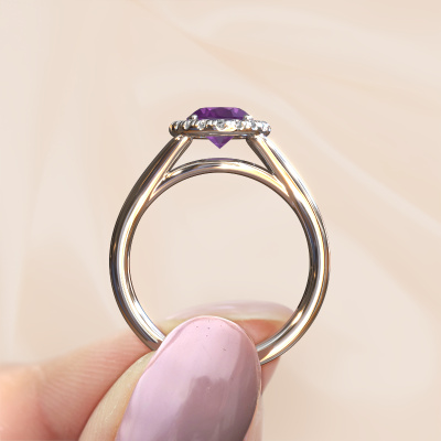 Cette bague de fiançailles porte le nom Verla ovl 1. Cette bague de fiançailles bandes séparées est forgée en or et est sertie d’un améthyste de 8x6 mm. Cette bague de fiançailles halo et forgée en platine unique est un pur travail d’art ! Tous les petits détails ont été fabriqués avec beaucoup de patience et de passion par notre orfèvre. Ce métier nécessite un œil expert et une main habile pour assembler cette bague de fiançailles avec la plus grande précision. Et ce travail est précisément ce qui enthousiasme nos orfèvres ! Les plus beaux améthystes sont sertis de manière large, de telle sorte qu'ils puissent rendre un effet encore meilleurs. Cela donne donc une allure supplémentaire à la bague de fiançailles. La bague de fiançailles est unique en raison de sa pierre précieuse naturelle, que nous avons spécialement sélectionnée pour cette bague. De plus, vous pouvez choisir vous-même la composition du métal précieux de votre bague. Vous aurez donc créé une bague de fiançailles unique pour la femmes la plus unique de votre vie ! Ce bijou est fabriquées avec passion et amour par l'un de nos maîtres orfèvres.En combinant les dernières techniques modernes, associées à une fabrication ancienne, nous sommes en mesure de fabriquer nos bagues de fiançailles dans notre propre studio. Chaque bijou est fabriqué sur commande. Ceci est avantageux car nous sommes en mesure de vous proposer un prix que vous ne trouverez nulle part ailleurs.Avez-vous déjà des bague de fiançailles spécifiques en tête ? Une bague de fiançailles que vous avez vu quelque part. N'hésitez pas à nous faire part de vos souhaits et nous transformerons votre design en des bague de fiançailles uniques. Vous êtes en mesure de suivre l'évolution de la conception de vos bague de fiançailles car nous utilisons des dessins en 3D. Cela vous donnera un aperçu réaliste de votre design. Nous vous enverrons volontiers une offre sans engagement basée sur un rapport qualité / prix juste. Elle va vous étonner.Pour vous faciliter la tâche, vous pouvez facilement nous retourner tout bijou commandé dans les 30 jours suivant la livraison.