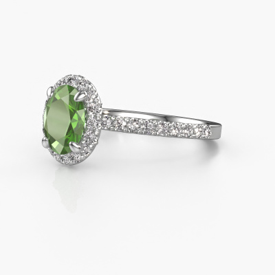 La bague de fiançailles mentionnée ci-dessus est nommée Miranda ovl. Nous appelons ce type de bague de fiançailles une bague Halo. La bague de fiançailles est forgée en or et comporte un vert tourmaline ovale de la de 8x6 mm et autour duquel sont sertis de petits diamants synthétiques. La largeur de cette bague de fiançailles halo forgée en platine exclusives vient des plus petites pierres précieuses qui sont serties autour du large vert tourmaline central. C’est également ce à partir de quoi cette belle bague de fiançailles tire son nom : halo signifie halo et c’est aussi l’effet que rendent les pierres précieuses plus petites. Cependant, ces pierres précieuses plus petites doivent toutes être serties de la même manière, afin que la lumière ne soit pas seulement introduite dans le vert tourmaline et qu’un véritable halo de lumière soit créé. Et c'est ce que font nos maîtres orfèvres. Avec la plus grande précision, chaque vert tourmaline soigneusement sélectionné est placé à la main dans la bague de fiançailles. Encore et encore, la bague de fiançailles est maintenue à la lumière pour voir si l'effet spécial est toujours visible. Le résultat est une bague de fiançailles unique, où le vert tourmaline choisi devient littéralement le centre brillants. Vous pouvez imaginer que cette bague de fiançailles est vraiment une bague de fiançailles significative à offrir à votre amour de la vie ! Le jour où vous montrez qu’elle est votre centre brillants ! En combinant les dernières techniques modernes, associées à une fabrication ancienne, nous sommes en mesure de fabriquer nos bagues de fiançailles dans notre propre studio. Chaque bijou est fabriqué sur commande. Ceci est avantageux car nous sommes en mesure de vous proposer un prix que vous ne trouverez nulle part ailleurs.Notre équipe de designers talentueux et passionnés ajoute chaque jour de nouveaux modèles bague de fiançailles à notre collection en ligne. Notre objectif est de pouvoir vous offrir une grande variété de bijoux. N'hésitez pas à demander un devis si vous avez des souhaits spécifiques pour votre bague de fiançailles. Nous garantissons de vous faire une offre que vous ne pourrez pas refuser.Pour vous faciliter la tâche, vous pouvez facilement nous retourner tout bijou commandé dans les 30 jours suivant la livraison.