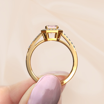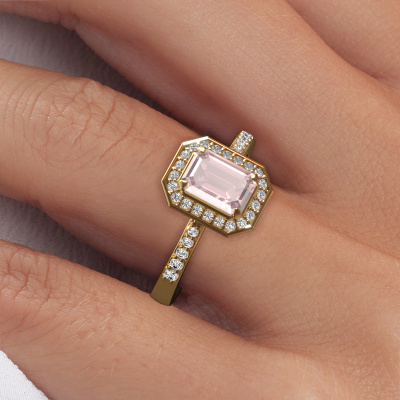 Cette bague de fiançailles porte le nom Dodie 2 eme. Cette bague de fiançailles belles est forgée en or 14 Carat et est sertie d’un champagne morganite de 7x5 mm. Cette bague de fiançailles halo et forgée en or jaune unique est un pur travail d’art ! Tous les petits détails ont été fabriqués avec beaucoup de patience et de passion par notre orfèvre. Ce métier nécessite un œil expert et une main habile pour assembler cette bague de fiançailles avec la plus grande précision. Et ce travail est précisément ce qui enthousiasme nos orfèvres ! Les plus beaux champagne morganite sont sertis de manière large, de telle sorte qu'ils puissent rendre un effet encore meilleurs. Cela donne donc une allure supplémentaire à la bague de fiançailles. La bague de fiançailles est unique en raison de sa pierre précieuse naturelle, que nous avons spécialement sélectionnée pour cette bague. De plus, vous pouvez choisir vous-même la composition du métal précieux de votre bague. Vous aurez donc créé une bague de fiançailles unique pour la femmes la plus unique de votre vie ! Ce bijou est spécialement conçues pour vous, avec une attention particulière portée aux détails et au design.Puisque nous concevons et livrons nos propres bijoux, nous sommes en mesure de vous proposer une bague de fiançailles à un prix que vous ne pourrez pas trouver ailleurs. Une alliance est fabriquée sur commande, ce qui permet d'éviter les excédents de matériel et nous permet de vous proposer une superbe offre de prix. Nous comprenons qu'acheter votre bague de fiançailles en ligne soit un risque, mais nous vous assistons volontiers dans le processus de conception, en tenant compte de votre budget.Avez-vous déjà des bague de fiançailles spécifiques en tête ? Une bague de fiançailles que vous avez vu quelque part. N'hésitez pas à nous faire part de vos souhaits et nous transformerons votre design en des bague de fiançailles uniques. Vous êtes en mesure de suivre l'évolution de la conception de vos bague de fiançailles car nous utilisons des dessins en 3D. Cela vous donnera un aperçu réaliste de votre design. Nous vous enverrons volontiers une offre sans engagement basée sur un rapport qualité / prix juste. Elle va vous étonner.Pour vous faciliter la tâche, vous pouvez facilement nous retourner tout bijou commandé dans les 30 jours suivant la livraison.