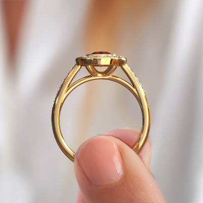 La bague de fiançailles mentionnée ci-dessus est nommée Noud 2 RND. Nous appelons ce type de bague de fiançailles une bague Halo. La bague de fiançailles est forgée en or 14 Carat et comporte un grenat ronds de la de 5 mm et autour duquel sont sertis de petits diamants. La largeur de cette bague de fiançailles halo forgée en or jaune luxes vient des plus petites pierres précieuses qui sont serties autour du large grenat central. C’est également ce à partir de quoi cette belle bague de fiançailles tire son nom : halo signifie halo et c’est aussi l’effet que rendent les pierres précieuses plus petites. Cependant, ces pierres précieuses plus petites doivent toutes être serties de la même manière, afin que la lumière ne soit pas seulement introduite dans le grenat et qu’un véritable halo de lumière soit créé. Et c'est ce que font nos maîtres orfèvres. Avec la plus grande précision, chaque grenat soigneusement sélectionné est placé à la main dans la bague de fiançailles. Encore et encore, la bague de fiançailles est maintenue à la lumière pour voir si l'effet spécial est toujours visible. Le résultat est une bague de fiançailles unique, où le grenat choisi devient littéralement le centre brillants. Vous pouvez imaginer que cette bague de fiançailles est vraiment une bague de fiançailles significative à offrir à votre amour de la vie ! Le jour où vous montrez qu’elle est votre centre brillants ! En combinant les dernières techniques modernes, associées à une fabrication ancienne, nous sommes en mesure de fabriquer nos bagues de fiançailles dans notre propre studio. Chaque bijou est fabriqué sur commande. Ceci est avantageux car nous sommes en mesure de vous proposer un prix que vous ne trouverez nulle part ailleurs.Avez-vous déjà des bague de fiançailles spécifiques en tête ? Une bague de fiançailles que vous avez vu quelque part. N'hésitez pas à nous faire part de vos souhaits et nous transformerons votre design en des bague de fiançailles uniques. Vous êtes en mesure de suivre l'évolution de la conception de vos bague de fiançailles car nous utilisons des dessins en 3D. Cela vous donnera un aperçu réaliste de votre design. Nous vous enverrons volontiers une offre sans engagement basée sur un rapport qualité / prix juste. Elle va vous étonner.Pour vous faciliter la tâche, vous pouvez facilement nous retourner tout bijou commandé dans les 30 jours suivant la livraison.