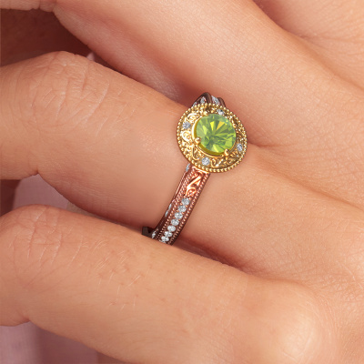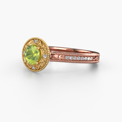 Nous avons donné le nom Alice RND à cette bague de fiançailles. Cette bague forgée en or 14 Carat est sertie d’un péridot de 5 mm. Cette bague est une large bague vintage forgée en or rose unique qui fera certainement briller l’amour de votre vie ! Et c'est exactement ce que nous avons comme objectif. Un beau péridot est serti dans cette bague de fiançailles vintage. Vous pouvez, bien entendu, utiliser chaque pierre précieuses que nous proposons sur notre site La pierre précieuse sera sélectionnée avec soin, car nous pensons que seule la plus belle des pierres précieuses peut briller sur votre bague de fiançailles millegrain, qu’en dites-vous ? Notre orfèvre fabrique votre bague de fiançailles dans notre propre atelier et place le péridot dans l'anneau de la bague avec une précision extrême. Donc, elle est travaillée et polie jusqu'à ce que le résultat désiré soit visible : la bague de fiançailles parfaite pour l'amour de votre vie ! Ce bijou est fabriquées avec passion et amour par l'un de nos maîtres orfèvres.Vous avez peut-être remarqué que nos prix sont en moyenne inférieurs de 30% à ceux d'un autre bijoutier. Et ce alors que la qualité de nos bijoux est même plus élevée dans la plupart des cas ! En effet, nos orfèvres fabriquent votre bague de fiançailles directement dans notre propre atelier. Cela signifie que nous n'avons pas à inclure des frais de stocks coûteux et que nous pouvons travailler n'importe quel détail directement sur votre bague de fiançailles.Notre équipe ajoute quotidiennement de nouveaux modèles à notre collection en ligne. Nos designers et orfèvres travaillent ensemble pour créer le meilleur design. Nous nous efforçons d'offrir une collection diversifiée de bijoux. Peut-être avez-vous déjà en tête un bijou en particulier ? Un bijou que vous avez trouvé quelque part. Veuillez nous contacter pour une consultation gratuite. Nous vous ferons une offre, basée sur un rapport qualité / prix juste, qui vous déconcertera.Pour vous faciliter la tâche, vous pouvez facilement nous retourner tout bijou commandé dans les 30 jours suivant la livraison.