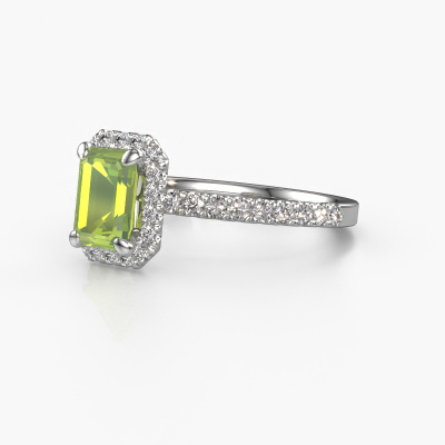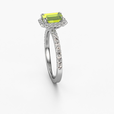 La bague de fiançailles mentionnée ci-dessus est nommée Miranda eme. Nous appelons ce type de bague de fiançailles une bague Halo. La bague de fiançailles est forgée en or et comporte un péridot taille émeraude de la de 7x5 mm et autour duquel sont sertis de petits diamants. La largeur de cette bague de fiançailles halo forgée en platine classiques vient des plus petites pierres précieuses qui sont serties autour du large péridot central. C’est également ce à partir de quoi cette belle bague de fiançailles tire son nom : halo signifie halo et c’est aussi l’effet que rendent les pierres précieuses plus petites. Cependant, ces pierres précieuses plus petites doivent toutes être serties de la même manière, afin que la lumière ne soit pas seulement introduite dans le péridot et qu’un véritable halo de lumière soit créé. Et c'est ce que font nos maîtres orfèvres. Avec la plus grande précision, chaque péridot soigneusement sélectionné est placé à la main dans la bague de fiançailles. Encore et encore, la bague de fiançailles est maintenue à la lumière pour voir si l'effet spécial est toujours visible. Le résultat est une bague de fiançailles unique, où le péridot choisi devient littéralement le centre brillants. Vous pouvez imaginer que cette bague de fiançailles est vraiment une bague de fiançailles significative à offrir à votre amour de la vie ! Le jour où vous montrez qu’elle est votre centre brillants ! En combinant les dernières techniques modernes, associées à une fabrication ancienne, nous sommes en mesure de fabriquer nos bagues de fiançailles dans notre propre studio. Chaque bijou est fabriqué sur commande. Ceci est avantageux car nous sommes en mesure de vous proposer un prix que vous ne trouverez nulle part ailleurs.Notre équipe de designers talentueux et passionnés ajoute chaque jour de nouveaux modèles bague de fiançailles à notre collection en ligne. Notre objectif est de pouvoir vous offrir une grande variété de bijoux. N'hésitez pas à demander un devis si vous avez des souhaits spécifiques pour votre bague de fiançailles. Nous garantissons de vous faire une offre que vous ne pourrez pas refuser.Pour vous faciliter la tâche, vous pouvez facilement nous retourner tout bijou commandé dans les 30 jours suivant la livraison.