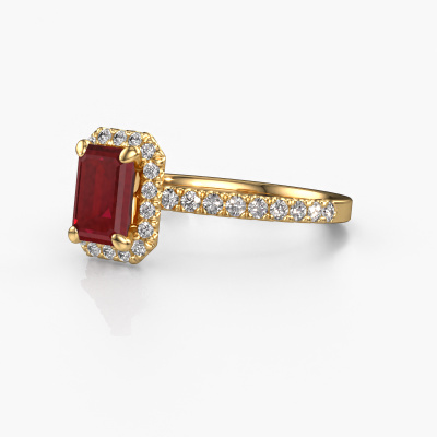 La bague de fiançailles mentionnée ci-dessus est nommée Miranda eme. Nous appelons ce type de bague de fiançailles une bague Halo. La bague de fiançailles est forgée en or 14 Carat et comporte un rubis taille émeraude de la de 7x5 mm et autour duquel sont sertis de petits diamants. La largeur de cette bague de fiançailles halo forgée en or jaune classiques vient des plus petites pierres précieuses qui sont serties autour du large rubis central. C’est également ce à partir de quoi cette belle bague de fiançailles tire son nom : halo signifie halo et c’est aussi l’effet que rendent les pierres précieuses plus petites. Cependant, ces pierres précieuses plus petites doivent toutes être serties de la même manière, afin que la lumière ne soit pas seulement introduite dans le rubis et qu’un véritable halo de lumière soit créé. Et c'est ce que font nos maîtres orfèvres. Avec la plus grande précision, chaque rubis soigneusement sélectionné est placé à la main dans la bague de fiançailles. Encore et encore, la bague de fiançailles est maintenue à la lumière pour voir si l'effet spécial est toujours visible. Le résultat est une bague de fiançailles unique, où le rubis choisi devient littéralement le centre brillants. Vous pouvez imaginer que cette bague de fiançailles est vraiment une bague de fiançailles significative à offrir à votre amour de la vie ! Le jour où vous montrez qu’elle est votre centre brillants ! En combinant les dernières techniques modernes, associées à une fabrication ancienne, nous sommes en mesure de fabriquer nos bagues de fiançailles dans notre propre studio. Chaque bijou est fabriqué sur commande. Ceci est avantageux car nous sommes en mesure de vous proposer un prix que vous ne trouverez nulle part ailleurs.Notre équipe de designers talentueux et passionnés ajoute chaque jour de nouveaux modèles bague de fiançailles à notre collection en ligne. Notre objectif est de pouvoir vous offrir une grande variété de bijoux. N'hésitez pas à demander un devis si vous avez des souhaits spécifiques pour votre bague de fiançailles. Nous garantissons de vous faire une offre que vous ne pourrez pas refuser.Pour vous faciliter la tâche, vous pouvez facilement nous retourner tout bijou commandé dans les 30 jours suivant la livraison.