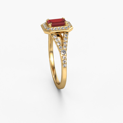 Cette bague de fiançailles porte le nom Pamela EME. Cette bague de fiançailles bandes séparées est forgée en or 14 Carat et est sertie d’un rubis de 6x4 mm. Cette bague de fiançailles halo et forgée en or jaune unique est un pur travail d’art ! Tous les petits détails ont été fabriqués avec beaucoup de patience et de passion par notre orfèvre. Ce métier nécessite un œil expert et une main habile pour assembler cette bague de fiançailles avec la plus grande précision. Et ce travail est précisément ce qui enthousiasme nos orfèvres ! Les plus beaux rubis sont sertis de manière large, de telle sorte qu'ils puissent rendre un effet encore meilleurs. Cela donne donc une allure supplémentaire à la bague de fiançailles. La bague de fiançailles est unique en raison de sa pierre précieuse naturelle, que nous avons spécialement sélectionnée pour cette bague. De plus, vous pouvez choisir vous-même la composition du métal précieux de votre bague. Vous aurez donc créé une bague de fiançailles unique pour la femmes la plus unique de votre vie ! Ce bijou est spécialement conçues pour vous, avec une attention particulière portée aux détails et au design.Puisque nous concevons et livrons nos propres bijoux, nous sommes en mesure de vous proposer une bague de fiançailles à un prix que vous ne pourrez pas trouver ailleurs. Une alliance est fabriquée sur commande, ce qui permet d'éviter les excédents de matériel et nous permet de vous proposer une superbe offre de prix. Nous comprenons qu'acheter votre bague de fiançailles en ligne soit un risque, mais nous vous assistons volontiers dans le processus de conception, en tenant compte de votre budget.Notre équipe ajoute quotidiennement de nouveaux modèles à notre collection en ligne. Nos designers et orfèvres travaillent ensemble pour créer le meilleur design. Nous nous efforçons d'offrir une collection diversifiée de bijoux. Peut-être avez-vous déjà en tête un bijou en particulier ? Un bijou que vous avez trouvé quelque part. Veuillez nous contacter pour une consultation gratuite. Nous vous ferons une offre, basée sur un rapport qualité / prix juste, qui vous déconcertera.Pour vous faciliter la tâche, vous pouvez facilement nous retourner tout bijou commandé dans les 30 jours suivant la livraison.