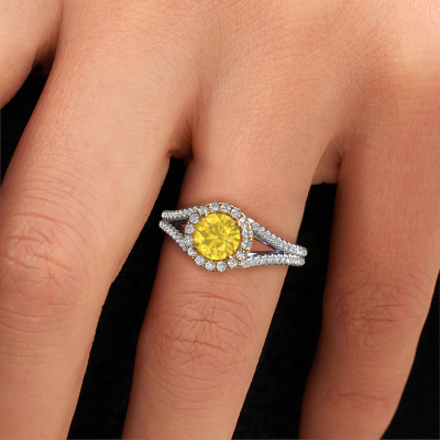 Cette bague de fiançailles porte le nom Verla rnd 2. Cette bague de fiançailles bandes séparées est forgée en or 14 Carat et est sertie d’un saphir jaune de 6.5 mm. Cette bague de fiançailles halo et forgée en or blanc unique est un pur travail d’art ! Tous les petits détails ont été fabriqués avec beaucoup de patience et de passion par notre orfèvre. Ce métier nécessite un œil expert et une main habile pour assembler cette bague de fiançailles avec la plus grande précision. Et ce travail est précisément ce qui enthousiasme nos orfèvres ! Les plus beaux saphirs jaunes sont sertis de manière large, de telle sorte qu'ils puissent rendre un effet encore meilleurs. Cela donne donc une allure supplémentaire à la bague de fiançailles. La bague de fiançailles est unique en raison de sa pierre précieuse naturelle, que nous avons spécialement sélectionnée pour cette bague. De plus, vous pouvez choisir vous-même la composition du métal précieux de votre bague. Vous aurez donc créé une bague de fiançailles unique pour la femmes la plus unique de votre vie ! Ce bijou est spécialement conçues pour vous, avec une attention particulière portée aux détails et au design.Puisque nous concevons et livrons nos propres bijoux, nous sommes en mesure de vous proposer une bague de fiançailles à un prix que vous ne pourrez pas trouver ailleurs. Une alliance est fabriquée sur commande, ce qui permet d'éviter les excédents de matériel et nous permet de vous proposer une superbe offre de prix. Nous comprenons qu'acheter votre bague de fiançailles en ligne soit un risque, mais nous vous assistons volontiers dans le processus de conception, en tenant compte de votre budget.Notre équipe ajoute quotidiennement de nouveaux modèles à notre collection en ligne. Nos designers et orfèvres travaillent ensemble pour créer le meilleur design. Nous nous efforçons d'offrir une collection diversifiée de bijoux. Peut-être avez-vous déjà en tête un bijou en particulier ? Un bijou que vous avez trouvé quelque part. Veuillez nous contacter pour une consultation gratuite. Nous vous ferons une offre, basée sur un rapport qualité / prix juste, qui vous déconcertera.Pour vous faciliter la tâche, vous pouvez facilement nous retourner tout bijou commandé dans les 30 jours suivant la livraison.