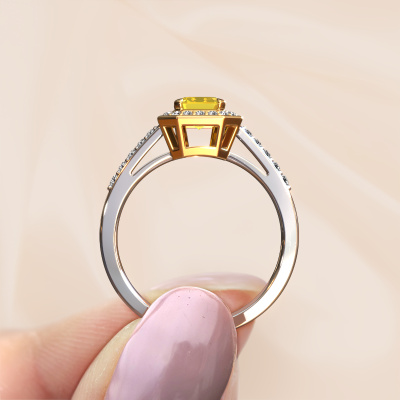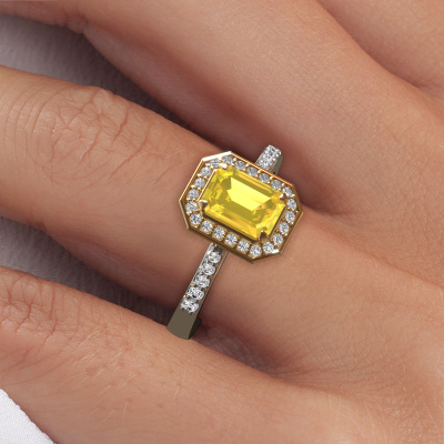 Cette bague de fiançailles porte le nom Dodie 2 eme. Cette bague de fiançailles belles est forgée en or 14 Carat et est sertie d’un saphir jaune de 7x5 mm. Cette bague de fiançailles halo et forgée en or blanc unique est un pur travail d’art ! Tous les petits détails ont été fabriqués avec beaucoup de patience et de passion par notre orfèvre. Ce métier nécessite un œil expert et une main habile pour assembler cette bague de fiançailles avec la plus grande précision. Et ce travail est précisément ce qui enthousiasme nos orfèvres ! Les plus beaux saphirs jaunes sont sertis de manière large, de telle sorte qu'ils puissent rendre un effet encore meilleurs. Cela donne donc une allure supplémentaire à la bague de fiançailles. La bague de fiançailles est unique en raison de sa pierre précieuse naturelle, que nous avons spécialement sélectionnée pour cette bague. De plus, vous pouvez choisir vous-même la composition du métal précieux de votre bague. Vous aurez donc créé une bague de fiançailles unique pour la femmes la plus unique de votre vie ! Ce bijou est spécialement conçues pour vous, avec une attention particulière portée aux détails et au design.Puisque nous concevons et livrons nos propres bijoux, nous sommes en mesure de vous proposer une bague de fiançailles à un prix que vous ne pourrez pas trouver ailleurs. Une alliance est fabriquée sur commande, ce qui permet d'éviter les excédents de matériel et nous permet de vous proposer une superbe offre de prix. Nous comprenons qu'acheter votre bague de fiançailles en ligne soit un risque, mais nous vous assistons volontiers dans le processus de conception, en tenant compte de votre budget.Avez-vous déjà des bague de fiançailles spécifiques en tête ? Une bague de fiançailles que vous avez vu quelque part. N'hésitez pas à nous faire part de vos souhaits et nous transformerons votre design en des bague de fiançailles uniques. Vous êtes en mesure de suivre l'évolution de la conception de vos bague de fiançailles car nous utilisons des dessins en 3D. Cela vous donnera un aperçu réaliste de votre design. Nous vous enverrons volontiers une offre sans engagement basée sur un rapport qualité / prix juste. Elle va vous étonner.Pour vous faciliter la tâche, vous pouvez facilement nous retourner tout bijou commandé dans les 30 jours suivant la livraison.
