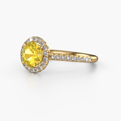 La bague de fiançailles mentionnée ci-dessus est nommée Seline rnd 2. Nous appelons ce type de bague de fiançailles une bague Halo. La bague de fiançailles est forgée en or 14 Carat et comporte un saphir jaune ronds de la de 6.5 mm et autour duquel sont sertis de petits diamants synthétiques. La largeur de cette bague de fiançailles halo forgée en or jaune exclusives vient des plus petites pierres précieuses qui sont serties autour du large saphir jaune central. C’est également ce à partir de quoi cette belle bague de fiançailles tire son nom : halo signifie halo et c’est aussi l’effet que rendent les pierres précieuses plus petites. Cependant, ces pierres précieuses plus petites doivent toutes être serties de la même manière, afin que la lumière ne soit pas seulement introduite dans le saphir jaune et qu’un véritable halo de lumière soit créé. Et c'est ce que font nos maîtres orfèvres. Avec la plus grande précision, chaque saphir jaune soigneusement sélectionné est placé à la main dans la bague de fiançailles. Encore et encore, la bague de fiançailles est maintenue à la lumière pour voir si l'effet spécial est toujours visible. Le résultat est une bague de fiançailles unique, où le saphir jaune choisi devient littéralement le centre brillants. Vous pouvez imaginer que cette bague de fiançailles est vraiment une bague de fiançailles significative à offrir à votre amour de la vie ! Le jour où vous montrez qu’elle est votre centre brillants ! Nos orfèvres ne fabriqueront votre bague de fiançailles qu'une fois que vous l'aurez commandée. Nous ne faisons pas de stock. L'avantage de cela est que nous n'avons pas à inclure les frais de stockage dans nos prix, et nous pouvons donc vous offrir des bijoux à un prix très bas.Notre équipe ajoute quotidiennement de nouveaux modèles à notre collection en ligne. Nos designers et orfèvres travaillent ensemble pour créer le meilleur design. Nous nous efforçons d'offrir une collection diversifiée de bijoux. Peut-être avez-vous déjà en tête un bijou en particulier ? Un bijou que vous avez trouvé quelque part. Veuillez nous contacter pour une consultation gratuite. Nous vous ferons une offre, basée sur un rapport qualité / prix juste, qui vous déconcertera.Pour vous faciliter la tâche, vous pouvez facilement nous retourner tout bijou commandé dans les 30 jours suivant la livraison.