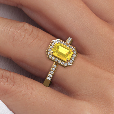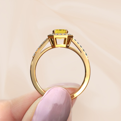 Cette bague de fiançailles porte le nom Dodie 2 eme. Cette bague de fiançailles belles est forgée en or 14 Carat et est sertie d’un saphir jaune de 7x5 mm. Cette bague de fiançailles halo et forgée en or jaune unique est un pur travail d’art ! Tous les petits détails ont été fabriqués avec beaucoup de patience et de passion par notre orfèvre. Ce métier nécessite un œil expert et une main habile pour assembler cette bague de fiançailles avec la plus grande précision. Et ce travail est précisément ce qui enthousiasme nos orfèvres ! Les plus beaux saphirs jaunes sont sertis de manière large, de telle sorte qu'ils puissent rendre un effet encore meilleurs. Cela donne donc une allure supplémentaire à la bague de fiançailles. La bague de fiançailles est unique en raison de sa pierre précieuse naturelle, que nous avons spécialement sélectionnée pour cette bague. De plus, vous pouvez choisir vous-même la composition du métal précieux de votre bague. Vous aurez donc créé une bague de fiançailles unique pour la femmes la plus unique de votre vie ! Ce bijou est spécialement conçues pour vous, avec une attention particulière portée aux détails et au design.Puisque nous concevons et livrons nos propres bijoux, nous sommes en mesure de vous proposer une bague de fiançailles à un prix que vous ne pourrez pas trouver ailleurs. Une alliance est fabriquée sur commande, ce qui permet d'éviter les excédents de matériel et nous permet de vous proposer une superbe offre de prix. Nous comprenons qu'acheter votre bague de fiançailles en ligne soit un risque, mais nous vous assistons volontiers dans le processus de conception, en tenant compte de votre budget.Avez-vous déjà des bague de fiançailles spécifiques en tête ? Une bague de fiançailles que vous avez vu quelque part. N'hésitez pas à nous faire part de vos souhaits et nous transformerons votre design en des bague de fiançailles uniques. Vous êtes en mesure de suivre l'évolution de la conception de vos bague de fiançailles car nous utilisons des dessins en 3D. Cela vous donnera un aperçu réaliste de votre design. Nous vous enverrons volontiers une offre sans engagement basée sur un rapport qualité / prix juste. Elle va vous étonner.Pour vous faciliter la tâche, vous pouvez facilement nous retourner tout bijou commandé dans les 30 jours suivant la livraison.