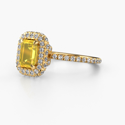 La bague de fiançailles mentionnée ci-dessus est nommée Talitha EME. Nous appelons ce type de bague de fiançailles une bague Halo. La bague de fiançailles est forgée en or 14 Carat et comporte un saphir jaune taille émeraude de la de 7x5 mm et autour duquel sont sertis de petits diamants synthétiques. La largeur de cette bague de fiançailles halo forgée en or jaune luxes vient des plus petites pierres précieuses qui sont serties autour du large saphir jaune central. C’est également ce à partir de quoi cette belle bague de fiançailles tire son nom : halo signifie halo et c’est aussi l’effet que rendent les pierres précieuses plus petites. Cependant, ces pierres précieuses plus petites doivent toutes être serties de la même manière, afin que la lumière ne soit pas seulement introduite dans le saphir jaune et qu’un véritable halo de lumière soit créé. Et c'est ce que font nos maîtres orfèvres. Avec la plus grande précision, chaque saphir jaune soigneusement sélectionné est placé à la main dans la bague de fiançailles. Encore et encore, la bague de fiançailles est maintenue à la lumière pour voir si l'effet spécial est toujours visible. Le résultat est une bague de fiançailles unique, où le saphir jaune choisi devient littéralement le centre brillants. Vous pouvez imaginer que cette bague de fiançailles est vraiment une bague de fiançailles significative à offrir à votre amour de la vie ! Le jour où vous montrez qu’elle est votre centre brillants ! Qu'y a-t-il dorénavant de plus beau qu'une bague de fiançailles luxes conçue par vous-même et fabriquée à la main par nous. Vous pouvez personnaliser chaque modèle avec les différents métaux précieux et pierres précieuses. De cette façon, vous pourrez créer une bague de fiançailles unique. Cette bague peut être mise en place de plusieurs façons. Bien sûr, vous pouvez toujours nous contacter et nous serons heureux de vous aider à composer votre bague de fiançailles luxes Talitha EME. Vous aimez le design, mais vous souhaitez tout de même quelque chose qui vous convienne plus, ou bien vous souhaitez une pierre précieuse dans les bijoux que vous ne pouvez pas choisir sur notre site, contactez-nous et nous vous aiderons.Notre équipe ajoute quotidiennement de nouveaux modèles à notre collection en ligne. Nos designers et orfèvres travaillent ensemble pour créer le meilleur design. Nous nous efforçons d'offrir une collection diversifiée de bijoux. Peut-être avez-vous déjà en tête un bijou en particulier ? Un bijou que vous avez trouvé quelque part. Veuillez nous contacter pour une consultation gratuite. Nous vous ferons une offre, basée sur un rapport qualité / prix juste, qui vous déconcertera.Pour vous faciliter la tâche, vous pouvez facilement nous retourner tout bijou commandé dans les 30 jours suivant la livraison.