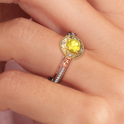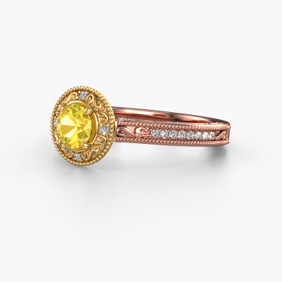 Nous avons donné le nom Alice RND à cette bague de fiançailles. Cette bague forgée en or 14 Carat est sertie d’un saphir jaune de 5 mm. Cette bague est une large bague vintage forgée en or rose unique qui fera certainement briller l’amour de votre vie ! Et c'est exactement ce que nous avons comme objectif. Un beau saphir jaune est serti dans cette bague de fiançailles vintage. Vous pouvez, bien entendu, utiliser chaque pierre précieuses que nous proposons sur notre site La pierre précieuse sera sélectionnée avec soin, car nous pensons que seule la plus belle des pierres précieuses peut briller sur votre bague de fiançailles millegrain, qu’en dites-vous ? Notre orfèvre fabrique votre bague de fiançailles dans notre propre atelier et place le saphir jaune dans l'anneau de la bague avec une précision extrême. Donc, elle est travaillée et polie jusqu'à ce que le résultat désiré soit visible : la bague de fiançailles parfaite pour l'amour de votre vie ! Ce bijou est fabriquées avec passion et amour par l'un de nos maîtres orfèvres.Vous avez peut-être remarqué que nos prix sont en moyenne inférieurs de 30% à ceux d'un autre bijoutier. Et ce alors que la qualité de nos bijoux est même plus élevée dans la plupart des cas ! En effet, nos orfèvres fabriquent votre bague de fiançailles directement dans notre propre atelier. Cela signifie que nous n'avons pas à inclure des frais de stocks coûteux et que nous pouvons travailler n'importe quel détail directement sur votre bague de fiançailles.Notre équipe ajoute quotidiennement de nouveaux modèles à notre collection en ligne. Nos designers et orfèvres travaillent ensemble pour créer le meilleur design. Nous nous efforçons d'offrir une collection diversifiée de bijoux. Peut-être avez-vous déjà en tête un bijou en particulier ? Un bijou que vous avez trouvé quelque part. Veuillez nous contacter pour une consultation gratuite. Nous vous ferons une offre, basée sur un rapport qualité / prix juste, qui vous déconcertera.Pour vous faciliter la tâche, vous pouvez facilement nous retourner tout bijou commandé dans les 30 jours suivant la livraison.