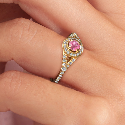 Cette bague de fiançailles porte le nom Pamela RND. Cette bague de fiançailles ajour est forgée en or 14 Carat et est sertie d’un saphir rose de 4 mm. Cette bague de fiançailles halo et forgée en or jaune unique est un pur travail d’art ! Tous les petits détails ont été fabriqués avec beaucoup de patience et de passion par notre orfèvre. Ce métier nécessite un œil expert et une main habile pour assembler cette bague de fiançailles avec la plus grande précision. Et ce travail est précisément ce qui enthousiasme nos orfèvres ! Les plus beaux saphirs roses sont sertis de manière large, de telle sorte qu'ils puissent rendre un effet encore meilleurs. Cela donne donc une allure supplémentaire à la bague de fiançailles. La bague de fiançailles est unique en raison de sa pierre précieuse naturelle, que nous avons spécialement sélectionnée pour cette bague. De plus, vous pouvez choisir vous-même la composition du métal précieux de votre bague. Vous aurez donc créé une bague de fiançailles unique pour la femmes la plus unique de votre vie ! Ce bijou est unique car vous pouvez entièrement l'assembler à votre guise.Puisque nous concevons et livrons nos propres bijoux, nous sommes en mesure de vous proposer une bague de fiançailles à un prix que vous ne pourrez pas trouver ailleurs. Une alliance est fabriquée sur commande, ce qui permet d'éviter les excédents de matériel et nous permet de vous proposer une superbe offre de prix. Nous comprenons qu'acheter votre bague de fiançailles en ligne soit un risque, mais nous vous assistons volontiers dans le processus de conception, en tenant compte de votre budget.Notre équipe ajoute quotidiennement de nouveaux modèles à notre collection en ligne. Nos designers et orfèvres travaillent ensemble pour créer le meilleur design. Nous nous efforçons d'offrir une collection diversifiée de bijoux. Peut-être avez-vous déjà en tête un bijou en particulier ? Un bijou que vous avez trouvé quelque part. Veuillez nous contacter pour une consultation gratuite. Nous vous ferons une offre, basée sur un rapport qualité / prix juste, qui vous déconcertera.Pour vous faciliter la tâche, vous pouvez facilement nous retourner tout bijou commandé dans les 30 jours suivant la livraison.