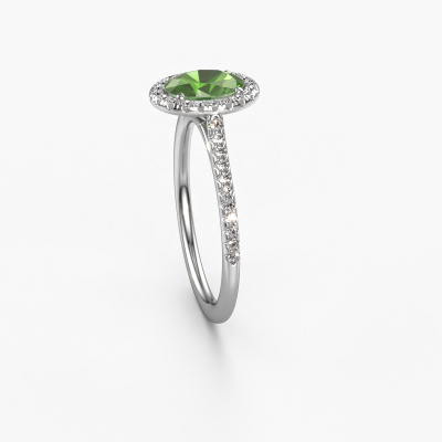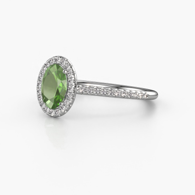 La bague de fiançailles mentionnée ci-dessus est nommée Seline ovl 2. Nous appelons ce type de bague de fiançailles une bague Halo. La bague de fiançailles est forgée en or 14 Carat et comporte un vert tourmaline ovale de la de 7x5 mm et autour duquel sont sertis de petits diamants. La largeur de cette bague de fiançailles halo forgée en or blanc exclusives vient des plus petites pierres précieuses qui sont serties autour du large vert tourmaline central. C’est également ce à partir de quoi cette belle bague de fiançailles tire son nom : halo signifie halo et c’est aussi l’effet que rendent les pierres précieuses plus petites. Cependant, ces pierres précieuses plus petites doivent toutes être serties de la même manière, afin que la lumière ne soit pas seulement introduite dans le vert tourmaline et qu’un véritable halo de lumière soit créé. Et c'est ce que font nos maîtres orfèvres. Avec la plus grande précision, chaque vert tourmaline soigneusement sélectionné est placé à la main dans la bague de fiançailles. Encore et encore, la bague de fiançailles est maintenue à la lumière pour voir si l'effet spécial est toujours visible. Le résultat est une bague de fiançailles unique, où le vert tourmaline choisi devient littéralement le centre brillants. Vous pouvez imaginer que cette bague de fiançailles est vraiment une bague de fiançailles significative à offrir à votre amour de la vie ! Le jour où vous montrez qu’elle est votre centre brillants ! Nos orfèvres ne fabriqueront votre bague de fiançailles qu'une fois que vous l'aurez commandée. Nous ne faisons pas de stock. L'avantage de cela est que nous n'avons pas à inclure les frais de stockage dans nos prix, et nous pouvons donc vous offrir des bijoux à un prix très bas.Notre équipe ajoute quotidiennement de nouveaux modèles à notre collection en ligne. Nos designers et orfèvres travaillent ensemble pour créer le meilleur design. Nous nous efforçons d'offrir une collection diversifiée de bijoux. Peut-être avez-vous déjà en tête un bijou en particulier ? Un bijou que vous avez trouvé quelque part. Veuillez nous contacter pour une consultation gratuite. Nous vous ferons une offre, basée sur un rapport qualité / prix juste, qui vous déconcertera.Pour vous faciliter la tâche, vous pouvez facilement nous retourner tout bijou commandé dans les 30 jours suivant la livraison.