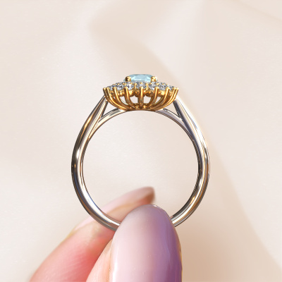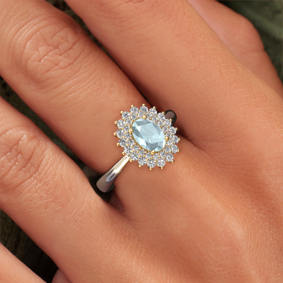 La bague de fiançailles présentée ci-dessus a été nommée Alina 1. Nous appelons ce type de bague de fiançailles une bague entourage, dans laquelle de petites pierres précieuses sont serties autour de la pierre centrale dans un sertissage ouvert. Cette bague de fiançailles forgée en or 14 Carat a un aigue-marine ovale de 7x5 mm en guise de pierre centrale qui est aussi entourée de petits diamants. La particularité de cette bague de fiançailles classiques forgée en or blanc est sa forme : les petites pierres précieuses et le aigue-marine forment une belle fleur qui semble se fondre en une large pierre précieuse étincelante. Cette bague de fiançailles est aussi appelée la bague de fiançailles fleur ou rosette. Nos maîtres orfèvres veillent à ce que les plus petits diamants soient tous sertis de la même manière, afin que la lumière passant au travers du aigue-marine ne soit pas interrompue et qu'une belle unité soit créée. Avec un œil expérimenté et une main habile, chaque aigue-marine soigneusement sélectionné est serti dans la bague de fiançailles. Toujours et encore, la bague de fiançailles est examinée sous la lumière pour voir si l'effet spécial désiré est encore visible. Le résultat est une bague de fiançailles unique, où le aigue-marine choisi devient littéralement le centre brillants. Quelle bague de fiançailles belle et significative à offrir au centre qui brille dans votre vie ! Vous avez peut-être remarqué que nos prix sont en moyenne inférieurs de 30% à ceux d'un autre bijoutier. Et ce alors que la qualité de nos bijoux est même plus élevée dans la plupart des cas ! En effet, nos orfèvres fabriquent votre bague de fiançailles directement dans notre propre atelier. Cela signifie que nous n'avons pas à inclure des frais de stocks coûteux et que nous pouvons travailler n'importe quel détail directement sur votre bague de fiançailles.Notre équipe de designers talentueux et passionnés ajoute chaque jour de nouveaux modèles bague de fiançailles à notre collection en ligne. Notre objectif est de pouvoir vous offrir une grande variété de bijoux. N'hésitez pas à demander un devis si vous avez des souhaits spécifiques pour votre bague de fiançailles. Nous garantissons de vous faire une offre que vous ne pourrez pas refuser.Pour vous faciliter la tâche, vous pouvez facilement nous retourner tout bijou commandé dans les 30 jours suivant la livraison.