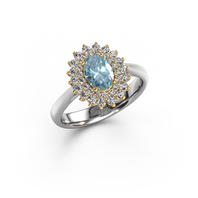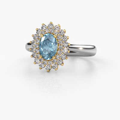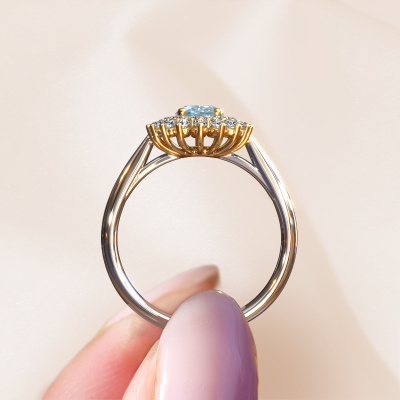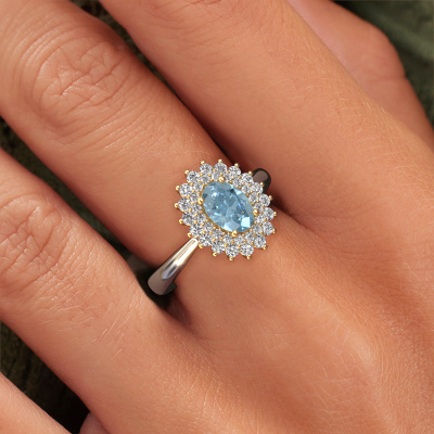 La bague de fiançailles présentée ci-dessus a été nommée Alina 1. Nous appelons ce type de bague de fiançailles une bague entourage, dans laquelle de petites pierres précieuses sont serties autour de la pierre centrale dans un sertissage ouvert. Cette bague de fiançailles forgée en or 14 Carat a un diamant synthétique bleu ovale de 7x5 mm en guise de pierre centrale qui est aussi entourée de petits diamants. La particularité de cette bague de fiançailles classiques forgée en or blanc est sa forme : les petites pierres précieuses et le diamant synthétique bleu forment une belle fleur qui semble se fondre en une large pierre précieuse étincelante. Cette bague de fiançailles est aussi appelée la bague de fiançailles fleur ou rosette. Nos maîtres orfèvres veillent à ce que les plus petits diamants soient tous sertis de la même manière, afin que la lumière passant au travers du diamant synthétique bleu ne soit pas interrompue et qu'une belle unité soit créée. Avec un œil expérimenté et une main habile, chaque diamant synthétique bleu soigneusement sélectionné est serti dans la bague de fiançailles. Toujours et encore, la bague de fiançailles est examinée sous la lumière pour voir si l'effet spécial désiré est encore visible. Le résultat est une bague de fiançailles unique, où le diamant synthétique bleu choisi devient littéralement le centre brillants. Quelle bague de fiançailles belle et significative à offrir au centre qui brille dans votre vie ! Vous avez peut-être remarqué que nos prix sont en moyenne inférieurs de 30% à ceux d'un autre bijoutier. Et ce alors que la qualité de nos bijoux est même plus élevée dans la plupart des cas ! En effet, nos orfèvres fabriquent votre bague de fiançailles directement dans notre propre atelier. Cela signifie que nous n'avons pas à inclure des frais de stocks coûteux et que nous pouvons travailler n'importe quel détail directement sur votre bague de fiançailles.Notre équipe de designers talentueux et passionnés ajoute chaque jour de nouveaux modèles bague de fiançailles à notre collection en ligne. Notre objectif est de pouvoir vous offrir une grande variété de bijoux. N'hésitez pas à demander un devis si vous avez des souhaits spécifiques pour votre bague de fiançailles. Nous garantissons de vous faire une offre que vous ne pourrez pas refuser.Pour vous faciliter la tâche, vous pouvez facilement nous retourner tout bijou commandé dans les 30 jours suivant la livraison.