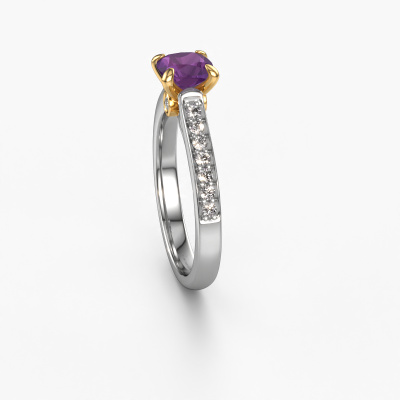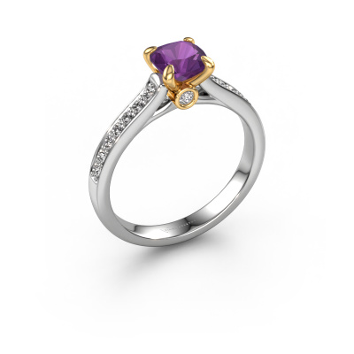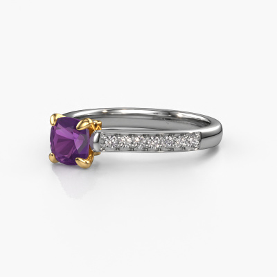 La bague de fiançailles mentionnée ci-dessus a été nommée Valorie cus 2. Ce type de bague de fiançailles est appelé une bague de fiançailles solitaire pavé car elle ne comporte qu’une seule pierre centrale et les tiges de la bague de fiançailles sont également pleins. La bague de fiançailles est faite dans une combinaison d'or 14 Carat et d’or jaune et a un améthyste coussin d’une de 5.5 mm, et des diamants sont sertis sur les épaules de l’anneau. Chaque bijou est fabriquées spécialement pour vous par nos maîtres orfèvres dans notre propre atelier. Cette bague de fiançailles solitaire pavé forgée en or blanc traditionnelles a un beau améthystes coussin comme pierre centrale, avec plus de améthystes sertis dans la bague pour accentuer encore plus la présence de la pierre centrale. Le sertissage à griffes autour du améthyste étant ouvert, le améthyste capte la lumière de tous les côtés et brille de manière optimale. Ci-dessus, vous pouvez voir comment notre orfèvre travaille la bague de fiançailles avec une extrême précision dans les moindres détails, de telle sorte que le améthyste élevé puisse attirer tous les regards. Quelle belle bague de fiançailles à offrir lors de votre demande en mariage à l'amour de votre vie, à votre centre rayonnant ! En combinant les dernières techniques modernes, associées à une fabrication ancienne, nous sommes en mesure de fabriquer nos bagues de fiançailles dans notre propre studio. Chaque bijou est fabriqué sur commande. Ceci est avantageux car nous sommes en mesure de vous proposer un prix que vous ne trouverez nulle part ailleurs.Notre équipe de designers talentueux et passionnés ajoute chaque jour de nouveaux modèles bague de fiançailles à notre collection en ligne. Notre objectif est de pouvoir vous offrir une grande variété de bijoux. N'hésitez pas à demander un devis si vous avez des souhaits spécifiques pour votre bague de fiançailles. Nous garantissons de vous faire une offre que vous ne pourrez pas refuser.Pour vous faciliter la tâche, vous pouvez facilement nous retourner tout bijou commandé dans les 30 jours suivant la livraison.