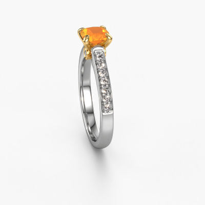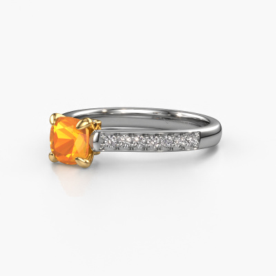 La bague de fiançailles mentionnée ci-dessus a été nommée Valorie cus 2. Ce type de bague de fiançailles est appelé une bague de fiançailles solitaire pavé car elle ne comporte qu’une seule pierre centrale et les tiges de la bague de fiançailles sont également pleins. La bague de fiançailles est faite dans une combinaison d'or 14 Carat et d’or jaune et a un citrine coussin d’une de 5.5 mm, et des diamants sont sertis sur les épaules de l’anneau. Chaque bijou est fabriquées spécialement pour vous par nos maîtres orfèvres dans notre propre atelier. Cette bague de fiançailles solitaire pavé forgée en or blanc traditionnelles a un beau citrines coussin comme pierre centrale, avec plus de citrines sertis dans la bague pour accentuer encore plus la présence de la pierre centrale. Le sertissage à griffes autour du citrine étant ouvert, le citrine capte la lumière de tous les côtés et brille de manière optimale. Ci-dessus, vous pouvez voir comment notre orfèvre travaille la bague de fiançailles avec une extrême précision dans les moindres détails, de telle sorte que le citrine élevé puisse attirer tous les regards. Quelle belle bague de fiançailles à offrir lors de votre demande en mariage à l'amour de votre vie, à votre centre rayonnant ! En combinant les dernières techniques modernes, associées à une fabrication ancienne, nous sommes en mesure de fabriquer nos bagues de fiançailles dans notre propre studio. Chaque bijou est fabriqué sur commande. Ceci est avantageux car nous sommes en mesure de vous proposer un prix que vous ne trouverez nulle part ailleurs.Notre équipe de designers talentueux et passionnés ajoute chaque jour de nouveaux modèles bague de fiançailles à notre collection en ligne. Notre objectif est de pouvoir vous offrir une grande variété de bijoux. N'hésitez pas à demander un devis si vous avez des souhaits spécifiques pour votre bague de fiançailles. Nous garantissons de vous faire une offre que vous ne pourrez pas refuser.Pour vous faciliter la tâche, vous pouvez facilement nous retourner tout bijou commandé dans les 30 jours suivant la livraison.