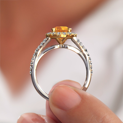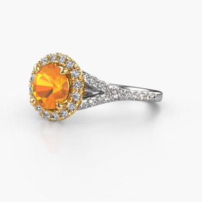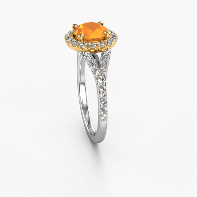 La bague de fiançailles mentionnée ci-dessus a été nommée Kimber RND. Ce type de bague de fiançailles est appelé une bague de fiançailles solitaire pavé car elle ne comporte qu’une seule pierre centrale et les tiges de la bague de fiançailles sont également pleins. La bague de fiançailles est faite dans une combinaison d'or 14 Carat et d’or jaune et a un citrine ronds d’une de 7 mm, et des diamants synthétiques sont sertis sur les épaules de l’anneau. Chaque bijou est faite pour briller sur votre doigt, chaque bijou est fabriqué à la main par nos orfèvres. Cette bague de fiançailles solitaire pavé forgée en or blanc classiques a un beau citrines ronds comme pierre centrale, avec plus de citrines sertis dans la bague pour accentuer encore plus la présence de la pierre centrale. Le sertissage à griffes autour du citrine étant ouvert, le citrine capte la lumière de tous les côtés et brille de manière optimale. Ci-dessus, vous pouvez voir comment notre orfèvre travaille la bague de fiançailles avec une extrême précision dans les moindres détails, de telle sorte que le citrine élevé puisse attirer tous les regards. Quelle belle bague de fiançailles à offrir lors de votre demande en mariage à l'amour de votre vie, à votre centre rayonnant ! Saviez-vous que nous offrons la garantie du meilleur prix pour votre bague de fiançailles? Cela est possible car tous nos bijoux sont fabriqués à la main dans notre propre atelier. Nous n'avons pas de frais de stocks qui sont coûteux, et nous fabriquons votre bague uniquement une fois que vous l'avez commandée. Grâce au fait que nous ayons toute la production du bijou en main, nous pouvons vous informer sur toutes les caractéristiques de cette bague de fiançailles. C’est précisément parce que l’achat d’une bague en ligne est une expérience excitante que nous comprenons qu’il est plus confortable pour vous de connaître toutes les caractéristiques de votre bague.Notre équipe ajoute quotidiennement de nouveaux modèles à notre collection en ligne. Nos designers et orfèvres travaillent ensemble pour créer le meilleur design. Nous nous efforçons d'offrir une collection diversifiée de bijoux. Peut-être avez-vous déjà en tête un bijou en particulier ? Un bijou que vous avez trouvé quelque part. Veuillez nous contacter pour une consultation gratuite. Nous vous ferons une offre, basée sur un rapport qualité / prix juste, qui vous déconcertera.Pour vous faciliter la tâche, vous pouvez facilement nous retourner tout bijou commandé dans les 30 jours suivant la livraison.