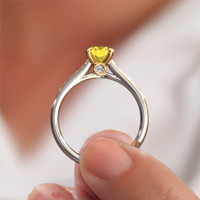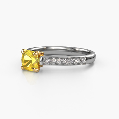 La bague de fiançailles mentionnée ci-dessus a été nommée Valorie cus 2. Ce type de bague de fiançailles est appelé une bague de fiançailles solitaire pavé car elle ne comporte qu’une seule pierre centrale et les tiges de la bague de fiançailles sont également pleins. La bague de fiançailles est faite dans une combinaison d'or 14 Carat et d’or jaune et a un saphir jaune coussin d’une de 5.5 mm, et des diamants sont sertis sur les épaules de l’anneau. Chaque bijou est fabriquées spécialement pour vous par nos maîtres orfèvres dans notre propre atelier. Cette bague de fiançailles solitaire pavé forgée en or blanc traditionnelles a un beau saphirs jaunes coussin comme pierre centrale, avec plus de saphirs jaunes sertis dans la bague pour accentuer encore plus la présence de la pierre centrale. Le sertissage à griffes autour du saphir jaune étant ouvert, le saphir jaune capte la lumière de tous les côtés et brille de manière optimale. Ci-dessus, vous pouvez voir comment notre orfèvre travaille la bague de fiançailles avec une extrême précision dans les moindres détails, de telle sorte que le saphir jaune élevé puisse attirer tous les regards. Quelle belle bague de fiançailles à offrir lors de votre demande en mariage à l'amour de votre vie, à votre centre rayonnant ! En combinant les dernières techniques modernes, associées à une fabrication ancienne, nous sommes en mesure de fabriquer nos bagues de fiançailles dans notre propre studio. Chaque bijou est fabriqué sur commande. Ceci est avantageux car nous sommes en mesure de vous proposer un prix que vous ne trouverez nulle part ailleurs.Notre équipe de designers talentueux et passionnés ajoute chaque jour de nouveaux modèles bague de fiançailles à notre collection en ligne. Notre objectif est de pouvoir vous offrir une grande variété de bijoux. N'hésitez pas à demander un devis si vous avez des souhaits spécifiques pour votre bague de fiançailles. Nous garantissons de vous faire une offre que vous ne pourrez pas refuser.Pour vous faciliter la tâche, vous pouvez facilement nous retourner tout bijou commandé dans les 30 jours suivant la livraison.