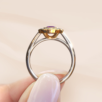 La bague de fiançailles mentionnée ci-dessus est nommée Noud 1 RND. Nous appelons ce type de bague de fiançailles une bague Halo. La bague de fiançailles est forgée en or 14 Carat et comporte un améthyste ronds de la de 4.7 mm et autour duquel sont sertis de petits diamants. La largeur de cette bague de fiançailles halo forgée en or blanc traditionnelles vient des plus petites pierres précieuses qui sont serties autour du large améthyste central. C’est également ce à partir de quoi cette belle bague de fiançailles tire son nom : halo signifie halo et c’est aussi l’effet que rendent les pierres précieuses plus petites. Cependant, ces pierres précieuses plus petites doivent toutes être serties de la même manière, afin que la lumière ne soit pas seulement introduite dans le améthyste et qu’un véritable halo de lumière soit créé. Et c'est ce que font nos maîtres orfèvres. Avec la plus grande précision, chaque améthyste soigneusement sélectionné est placé à la main dans la bague de fiançailles. Encore et encore, la bague de fiançailles est maintenue à la lumière pour voir si l'effet spécial est toujours visible. Le résultat est une bague de fiançailles unique, où le améthyste choisi devient littéralement le centre brillants. Vous pouvez imaginer que cette bague de fiançailles est vraiment une bague de fiançailles significative à offrir à votre amour de la vie ! Le jour où vous montrez qu’elle est votre centre brillants ! En combinant les dernières techniques modernes, associées à une fabrication ancienne, nous sommes en mesure de fabriquer nos bagues de fiançailles dans notre propre studio. Chaque bijou est fabriqué sur commande. Ceci est avantageux car nous sommes en mesure de vous proposer un prix que vous ne trouverez nulle part ailleurs.Avez-vous déjà des bague de fiançailles spécifiques en tête ? Une bague de fiançailles que vous avez vu quelque part. N'hésitez pas à nous faire part de vos souhaits et nous transformerons votre design en des bague de fiançailles uniques. Vous êtes en mesure de suivre l'évolution de la conception de vos bague de fiançailles car nous utilisons des dessins en 3D. Cela vous donnera un aperçu réaliste de votre design. Nous vous enverrons volontiers une offre sans engagement basée sur un rapport qualité / prix juste. Elle va vous étonner.Pour vous faciliter la tâche, vous pouvez facilement nous retourner tout bijou commandé dans les 30 jours suivant la livraison.