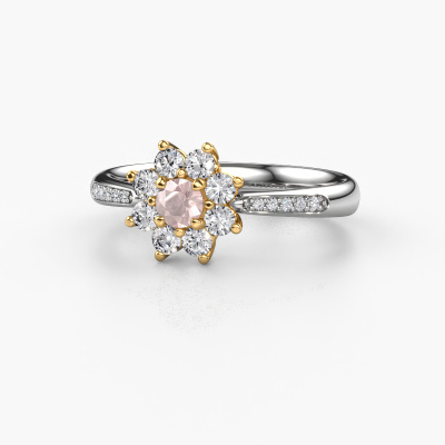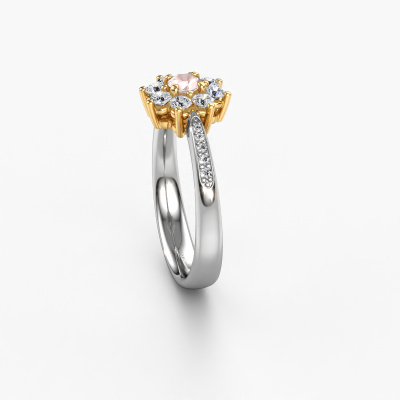 La bague de fiançailles présentée ci-dessus a été nommée Camille 2. Nous appelons ce type de bague de fiançailles une bague flower, dans laquelle de petites pierres précieuses sont serties autour de la pierre centrale dans un sertissage ouvert. Cette bague de fiançailles forgée en or 14 Carat a un champagne morganite ronds de 3.4 mm en guise de pierre centrale qui est aussi entourée de petits diamants. Si vous regardez cette bague de fiançailles flower forgée en or blanc, vous avez l'impression que les plus petites pierres précieuses, ainsi que le grand champagne morganite, fusionnent en une seule grosse pierre scintillante, sous la forme d’une belle fleur. Cette bague de fiançailles peut aussi avoir un autre nom tel que bague fleur ou la bague rosette. Cependant, les diamants plus petits doivent tous être sertis de la même manière, afin que la lumière passant au travers du champagne morganite ne soit pas interrompue et qu'une véritable unité soit créée. Voici donc le travail de nos maîtres orfèvres. Avec la plus grande précision, chaque champagne morganite soigneusement sélectionné est serti à la main dans la bague de fiançailles. Toujours et encore, la bague de fiançailles est surveillée de près sous la lumière pour voir si l'effet spécial désiré est toujours visible.
