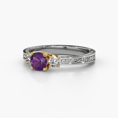 Cette bague de fiançailles porte le nom Betty 1. Cette bague de fiançailles forgée en or 14 Carat est sertie d’un améthyste. Cette bague de fiançailles unique est une large bague vintage forgée en or blanc qui laissera certainement briller l’amour de votre vie ! Et c'est exactement ce que nous avons comme objectif. De magnifiques améthystes ont été sertis sur cette bague de fiançailles Celtiques. Vous pouvez, bien entendu, utiliser chaque pierre précieuse que nous proposons sur notre site. La pierre précieuse sera sélectionnée avec soin, car nous pensons que seule la plus belle des pierres précieuses peut briller sur votre bague de fiançailles, qu’en dites-vous ? Notre orfèvre fabrique votre bague de fiançailles dans notre propre atelier et place le améthyste dans son anneau avec une précision extrême. Puis, elle est travaillée et polie jusqu'à ce que le résultat soit visible : la bague de fiançailles parfaite pour l'amour de votre vie ! Ce bijou est faite pour briller sur votre doigt, chaque bijou est fabriqué à la main par nos orfèvres.Vous avez peut-être remarqué que nos prix sont en moyenne inférieurs de 30% à ceux d'un autre bijoutier. Et ce alors que la qualité de nos bijoux est même plus élevée dans la plupart des cas ! En effet, nos orfèvres fabriquent votre bague de fiançailles directement dans notre propre atelier. Cela signifie que nous n'avons pas à inclure des frais de stocks coûteux et que nous pouvons travailler n'importe quel détail directement sur votre bague de fiançailles.Notre équipe ajoute quotidiennement de nouveaux modèles à notre collection en ligne. Nos designers et orfèvres travaillent ensemble pour créer le meilleur design. Nous nous efforçons d'offrir une collection diversifiée de bijoux. Peut-être avez-vous déjà en tête un bijou en particulier ? Un bijou que vous avez trouvé quelque part. Veuillez nous contacter pour une consultation gratuite. Nous vous ferons une offre, basée sur un rapport qualité / prix juste, qui vous déconcertera.Pour vous faciliter la tâche, vous pouvez facilement nous retourner tout bijou commandé dans les 30 jours suivant la livraison.