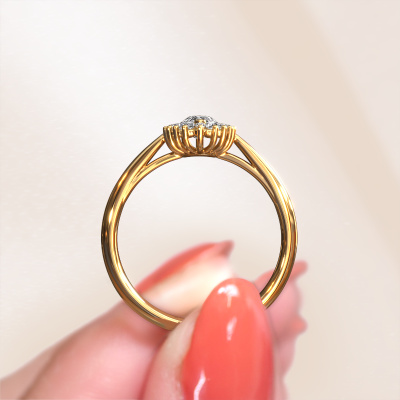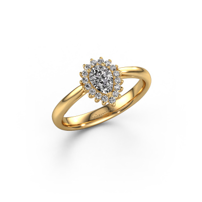 La bague de fiançailles présentée ci-dessus a été nommée Tilly per 1. Nous appelons ce type de bague de fiançailles une bague entourage, dans laquelle de petites pierres précieuses sont serties autour de la pierre centrale dans un sertissage ouvert. Cette bague de fiançailles forgée en or 14 Carat a un diamant poire de 0.45 crt en guise de pierre centrale qui est aussi entourée de petits diamants. La particularité de cette bague de fiançailles exclusives forgée en or jaune est sa forme : les petites pierres précieuses et le diamant forment une belle fleur qui semble se fondre en une large pierre précieuse étincelante. Cette bague de fiançailles est aussi appelée la bague de fiançailles fleur ou rosette. Nos maîtres orfèvres veillent à ce que les plus petits diamants soient tous sertis de la même manière, afin que la lumière passant au travers du diamant ne soit pas interrompue et qu'une belle unité soit créée. Avec un œil expérimenté et une main habile, chaque diamant soigneusement sélectionné est serti dans la bague de fiançailles. Toujours et encore, la bague de fiançailles est examinée sous la lumière pour voir si l'effet spécial désiré est encore visible. Le résultat est une bague de fiançailles unique, où le diamant choisi devient littéralement le centre brillants. Quelle bague de fiançailles belle et significative à offrir au centre qui brille dans votre vie ! Nos orfèvres ne fabriqueront votre bague de fiançailles qu'une fois que vous l'aurez commandée. Nous ne faisons pas de stock. L'avantage de cela est que nous n'avons pas à inclure les frais de stockage dans nos prix, et nous pouvons donc vous offrir des bijoux à un prix très bas.Notre équipe ajoute quotidiennement de nouveaux modèles à notre collection en ligne. Nos designers et orfèvres travaillent ensemble pour créer le meilleur design. Nous nous efforçons d'offrir une collection diversifiée de bijoux. Peut-être avez-vous déjà en tête un bijou en particulier ? Un bijou que vous avez trouvé quelque part. Veuillez nous contacter pour une consultation gratuite. Nous vous ferons une offre, basée sur un rapport qualité / prix juste, qui vous déconcertera.Pour vous faciliter la tâche, vous pouvez facilement nous retourner tout bijou commandé dans les 30 jours suivant la livraison.