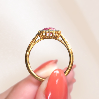 La bague de fiançailles présentée ci-dessus a été nommée Tilly per 1. Nous appelons ce type de bague de fiançailles une bague entourage, dans laquelle de petites pierres précieuses sont serties autour de la pierre centrale dans un sertissage ouvert. Cette bague de fiançailles forgée en or 14 Carat a un saphir rose poire de 8x6 mm en guise de pierre centrale qui est aussi entourée de petits diamants. La particularité de cette bague de fiançailles exclusives forgée en or jaune est sa forme : les petites pierres précieuses et le saphir rose forment une belle fleur qui semble se fondre en une large pierre précieuse étincelante. Cette bague de fiançailles est aussi appelée la bague de fiançailles fleur ou rosette. Nos maîtres orfèvres veillent à ce que les plus petits diamants soient tous sertis de la même manière, afin que la lumière passant au travers du saphir rose ne soit pas interrompue et qu'une belle unité soit créée. Avec un œil expérimenté et une main habile, chaque saphir rose soigneusement sélectionné est serti dans la bague de fiançailles. Toujours et encore, la bague de fiançailles est examinée sous la lumière pour voir si l'effet spécial désiré est encore visible. Le résultat est une bague de fiançailles unique, où le saphir rose choisi devient littéralement le centre brillants. Quelle bague de fiançailles belle et significative à offrir au centre qui brille dans votre vie ! Nos orfèvres ne fabriqueront votre bague de fiançailles qu'une fois que vous l'aurez commandée. Nous ne faisons pas de stock. L'avantage de cela est que nous n'avons pas à inclure les frais de stockage dans nos prix, et nous pouvons donc vous offrir des bijoux à un prix très bas.Notre équipe ajoute quotidiennement de nouveaux modèles à notre collection en ligne. Nos designers et orfèvres travaillent ensemble pour créer le meilleur design. Nous nous efforçons d'offrir une collection diversifiée de bijoux. Peut-être avez-vous déjà en tête un bijou en particulier ? Un bijou que vous avez trouvé quelque part. Veuillez nous contacter pour une consultation gratuite. Nous vous ferons une offre, basée sur un rapport qualité / prix juste, qui vous déconcertera.Pour vous faciliter la tâche, vous pouvez facilement nous retourner tout bijou commandé dans les 30 jours suivant la livraison.