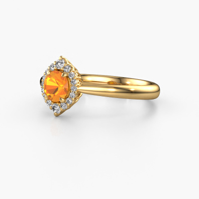 La bague de fiançailles présentée ci-dessus a été nommée Tora. Nous appelons ce type de bague de fiançailles une bague entourage, dans laquelle de petites pierres précieuses sont serties autour de la pierre centrale dans un sertissage ouvert. Cette bague de fiançailles forgée en or 14 Carat a un citrine ronds de 5 mm en guise de pierre centrale qui est aussi entourée de petits diamants synthétiques. La particularité de cette bague de fiançailles classiques forgée en or jaune est sa forme : les petites pierres précieuses et le citrine forment une belle fleur qui semble se fondre en une large pierre précieuse étincelante. Cette bague de fiançailles est aussi appelée la bague de fiançailles fleur ou rosette. Nos maîtres orfèvres veillent à ce que les plus petits diamants synthétiques soient tous sertis de la même manière, afin que la lumière passant au travers du citrine ne soit pas interrompue et qu'une belle unité soit créée. Avec un œil expérimenté et une main habile, chaque citrine soigneusement sélectionné est serti dans la bague de fiançailles. Toujours et encore, la bague de fiançailles est examinée sous la lumière pour voir si l'effet spécial désiré est encore visible. Le résultat est une bague de fiançailles unique, où le citrine choisi devient littéralement le centre brillants. Quelle bague de fiançailles belle et significative à offrir au centre qui brille dans votre vie ! En combinant les dernières techniques modernes, associées à une fabrication ancienne, nous sommes en mesure de fabriquer nos bagues de fiançailles dans notre propre studio. Chaque bijou est fabriqué sur commande. Ceci est avantageux car nous sommes en mesure de vous proposer un prix que vous ne trouverez nulle part ailleurs.Avez-vous déjà des bague de fiançailles spécifiques en tête ? Une bague de fiançailles que vous avez vu quelque part. N'hésitez pas à nous faire part de vos souhaits et nous transformerons votre design en des bague de fiançailles uniques. Vous êtes en mesure de suivre l'évolution de la conception de vos bague de fiançailles car nous utilisons des dessins en 3D. Cela vous donnera un aperçu réaliste de votre design. Nous vous enverrons volontiers une offre sans engagement basée sur un rapport qualité / prix juste. Elle va vous étonner.Pour vous faciliter la tâche, vous pouvez facilement nous retourner tout bijou commandé dans les 30 jours suivant la livraison.