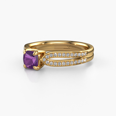 La bague de fiançailles mentionnée ci-dessus a été nommée Antonia cus 2. Ce type de bague de fiançailles est appelé une bague de fiançailles solitaire pavé car elle ne comporte qu’une seule pierre centrale et les tiges de la bague de fiançailles sont également pleins. La bague de fiançailles est faite dans une combinaison d'or 14 Carat et d’or jaune et a un améthyste coussin d’une de 5 mm, et des diamants synthétiques sont sertis sur les épaules de l’anneau. Chaque bijou est fabriquées spécialement pour vous par nos maîtres orfèvres dans notre propre atelier. Cette bague de fiançailles solitaire pavé forgée en or jaune fantaisie a un beau améthystes coussin comme pierre centrale, avec plus de améthystes sertis dans la bague pour accentuer encore plus la présence de la pierre centrale. Le sertissage à griffes autour du améthyste étant ouvert, le améthyste capte la lumière de tous les côtés et brille de manière optimale. Ci-dessus, vous pouvez voir comment notre orfèvre travaille la bague de fiançailles avec une extrême précision dans les moindres détails, de telle sorte que le améthyste élevé puisse attirer tous les regards. Quelle belle bague de fiançailles à offrir lors de votre demande en mariage à l'amour de votre vie, à votre centre rayonnant ! Qu'y a-t-il dorénavant de plus beau qu'une bague de fiançailles fantaisie conçue par vous-même et fabriquée à la main par nous. Vous pouvez personnaliser chaque modèle avec les différents métaux précieux et pierres précieuses. De cette façon, vous pourrez créer une bague de fiançailles unique. Cette bague peut être mise en place de plusieurs façons. Bien sûr, vous pouvez toujours nous contacter et nous serons heureux de vous aider à composer votre bague de fiançailles fantaisie Antonia cus 2. Vous aimez le design, mais vous souhaitez tout de même quelque chose qui vous convienne plus, ou bien vous souhaitez une pierre précieuse dans les bijoux que vous ne pouvez pas choisir sur notre site, contactez-nous et nous vous aiderons.Avez-vous déjà des bague de fiançailles spécifiques en tête ? Une bague de fiançailles que vous avez vu quelque part. N'hésitez pas à nous faire part de vos souhaits et nous transformerons votre design en des bague de fiançailles uniques. Vous êtes en mesure de suivre l'évolution de la conception de vos bague de fiançailles car nous utilisons des dessins en 3D. Cela vous donnera un aperçu réaliste de votre design. Nous vous enverrons volontiers une offre sans engagement basée sur un rapport qualité / prix juste. Elle va vous étonner.Pour vous faciliter la tâche, vous pouvez facilement nous retourner tout bijou commandé dans les 30 jours suivant la livraison.