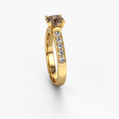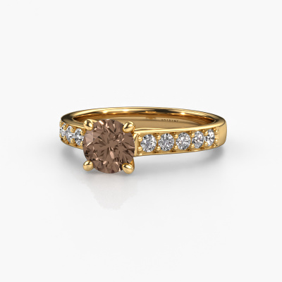 La bague de fiançailles mentionnée ci-dessus a été nommée Valorie RND 2. Ce type de bague de fiançailles est appelé une bague de fiançailles solitaire pavé car elle ne comporte qu’une seule pierre centrale et les tiges de la bague de fiançailles sont également pleins. La bague de fiançailles est faite dans une combinaison d'or 14 Carat et d’or jaune et a un diamant brun ronds d’une de 1.00 crt, et des diamants synthétiques sont sertis sur les épaules de l’anneau. Chaque bijou est faite spécialement pour vous, avec une attention particulière portée aux détails et au design. Cette bague de fiançailles solitaire pavé forgée en or jaune modernes a un beau diamants bruns ronds comme pierre centrale, avec plus de diamants bruns sertis dans la bague pour accentuer encore plus la présence de la pierre centrale. Le sertissage à griffes autour du diamant brun étant ouvert, le diamant brun capte la lumière de tous les côtés et brille de manière optimale. Ci-dessus, vous pouvez voir comment notre orfèvre travaille la bague de fiançailles avec une extrême précision dans les moindres détails, de telle sorte que le diamant brun élevé puisse attirer tous les regards. Quelle belle bague de fiançailles à offrir lors de votre demande en mariage à l'amour de votre vie, à votre centre rayonnant ! Qu'y a-t-il dorénavant de plus beau qu'une bague de fiançailles modernes conçue par vous-même et fabriquée à la main par nous. Vous pouvez personnaliser chaque modèle avec les différents métaux précieux et pierres précieuses. De cette façon, vous pourrez créer une bague de fiançailles unique. Cette bague peut être mise en place de plusieurs façons. Bien sûr, vous pouvez toujours nous contacter et nous serons heureux de vous aider à composer votre bague de fiançailles modernes Valorie RND 2. Vous aimez le design, mais vous souhaitez tout de même quelque chose qui vous convienne plus, ou bien vous souhaitez une pierre précieuse dans les bijoux que vous ne pouvez pas choisir sur notre site, contactez-nous et nous vous aiderons.Notre équipe de designers talentueux et passionnés ajoute chaque jour de nouveaux modèles bague de fiançailles à notre collection en ligne. Notre objectif est de pouvoir vous offrir une grande variété de bijoux. N'hésitez pas à demander un devis si vous avez des souhaits spécifiques pour votre bague de fiançailles. Nous garantissons de vous faire une offre que vous ne pourrez pas refuser.Pour vous faciliter la tâche, vous pouvez facilement nous retourner tout bijou commandé dans les 30 jours suivant la livraison.