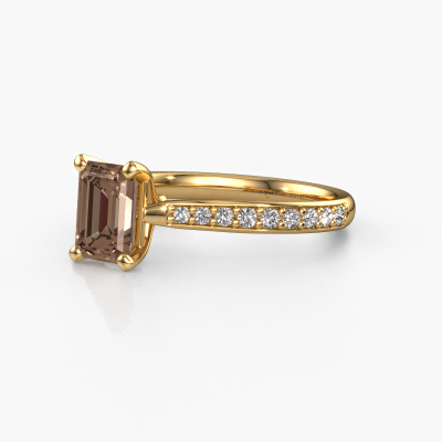 La bague de fiançailles mentionnée ci-dessus a été nommée Mignon eme 2. Ce type de bague de fiançailles est appelé une bague de fiançailles solitaire pavé car elle ne comporte qu’une seule pierre centrale et les tiges de la bague de fiançailles sont également pleins. La bague de fiançailles est faite dans une combinaison d'or 14 Carat et d’or jaune et a un diamant brun taille émeraude d’une de 1.15 crt, et des diamants synthétiques sont sertis sur les épaules de l’anneau. Chaque bijou est faite spécialement pour vous, avec une attention particulière portée aux détails et au design. Cette bague de fiançailles solitaire pavé forgée en or jaune exclusives a un beau diamants bruns taille émeraude comme pierre centrale, avec plus de diamants bruns sertis dans la bague pour accentuer encore plus la présence de la pierre centrale. Le sertissage à griffes autour du diamant brun étant ouvert, le diamant brun capte la lumière de tous les côtés et brille de manière optimale. Ci-dessus, vous pouvez voir comment notre orfèvre travaille la bague de fiançailles avec une extrême précision dans les moindres détails, de telle sorte que le diamant brun élevé puisse attirer tous les regards. Quelle belle bague de fiançailles à offrir lors de votre demande en mariage à l'amour de votre vie, à votre centre rayonnant ! Vous avez peut-être remarqué que nos prix sont en moyenne inférieurs de 30% à ceux d'un autre bijoutier. Et ce alors que la qualité de nos bijoux est même plus élevée dans la plupart des cas ! En effet, nos orfèvres fabriquent votre bague de fiançailles directement dans notre propre atelier. Cela signifie que nous n'avons pas à inclure des frais de stocks coûteux et que nous pouvons travailler n'importe quel détail directement sur votre bague de fiançailles.Avez-vous déjà des bague de fiançailles spécifiques en tête ? Une bague de fiançailles que vous avez vu quelque part. N'hésitez pas à nous faire part de vos souhaits et nous transformerons votre design en des bague de fiançailles uniques. Vous êtes en mesure de suivre l'évolution de la conception de vos bague de fiançailles car nous utilisons des dessins en 3D. Cela vous donnera un aperçu réaliste de votre design. Nous vous enverrons volontiers une offre sans engagement basée sur un rapport qualité / prix juste. Elle va vous étonner.Pour vous faciliter la tâche, vous pouvez facilement nous retourner tout bijou commandé dans les 30 jours suivant la livraison.